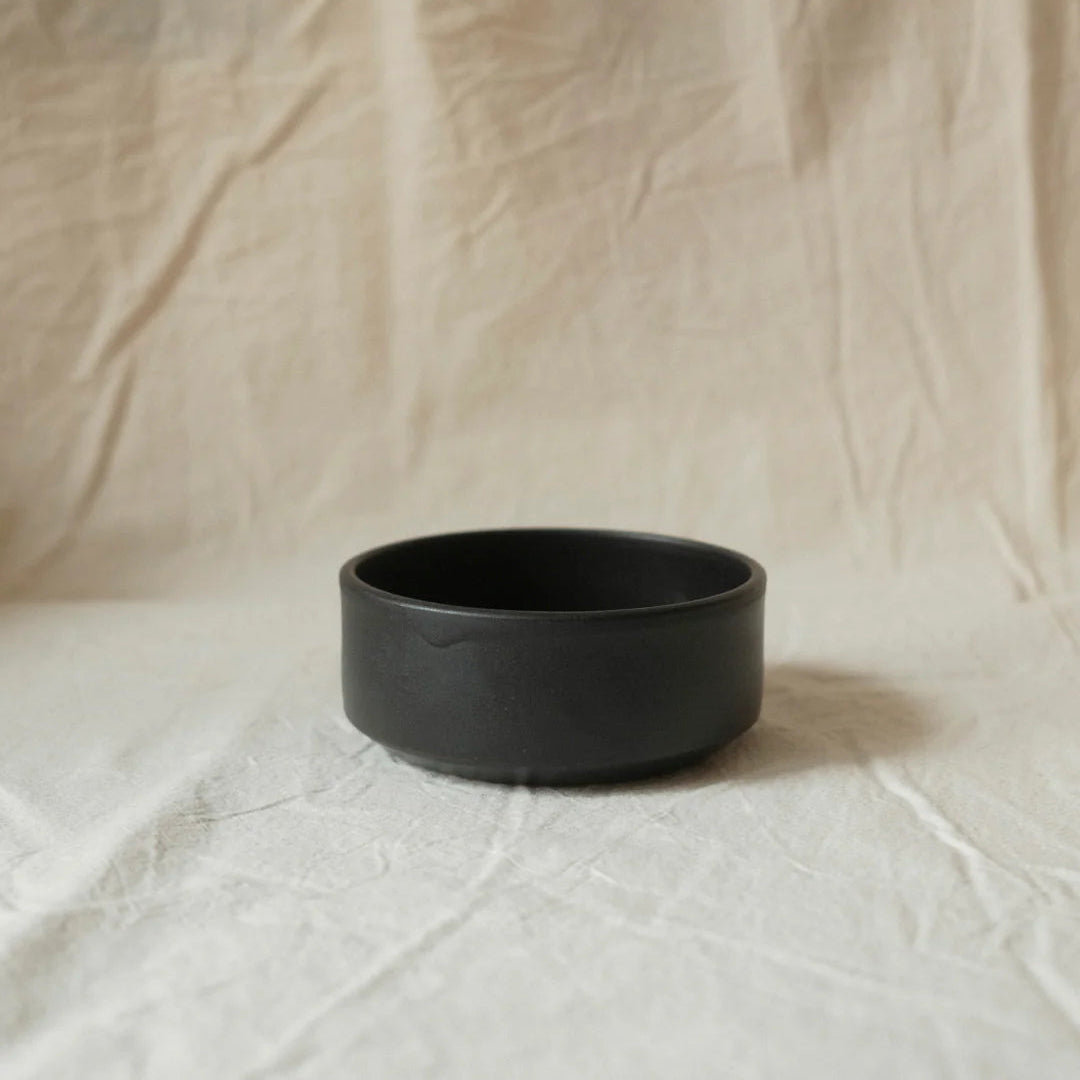 Smoke-kollektionen er fremstillet af lyst ler og glaseret med en markant, mat sort finish. I sollys kan glasuren afsløre subtile blå nuancer, der tilfører dybde til den rige sorte farve. Kontrasten mellem den glatte, mørke glasur og den lyse, rå ler-kant i bunden skaber en smuk effekt med en lys brun polering, der fremhæver lerets naturlige struktur.