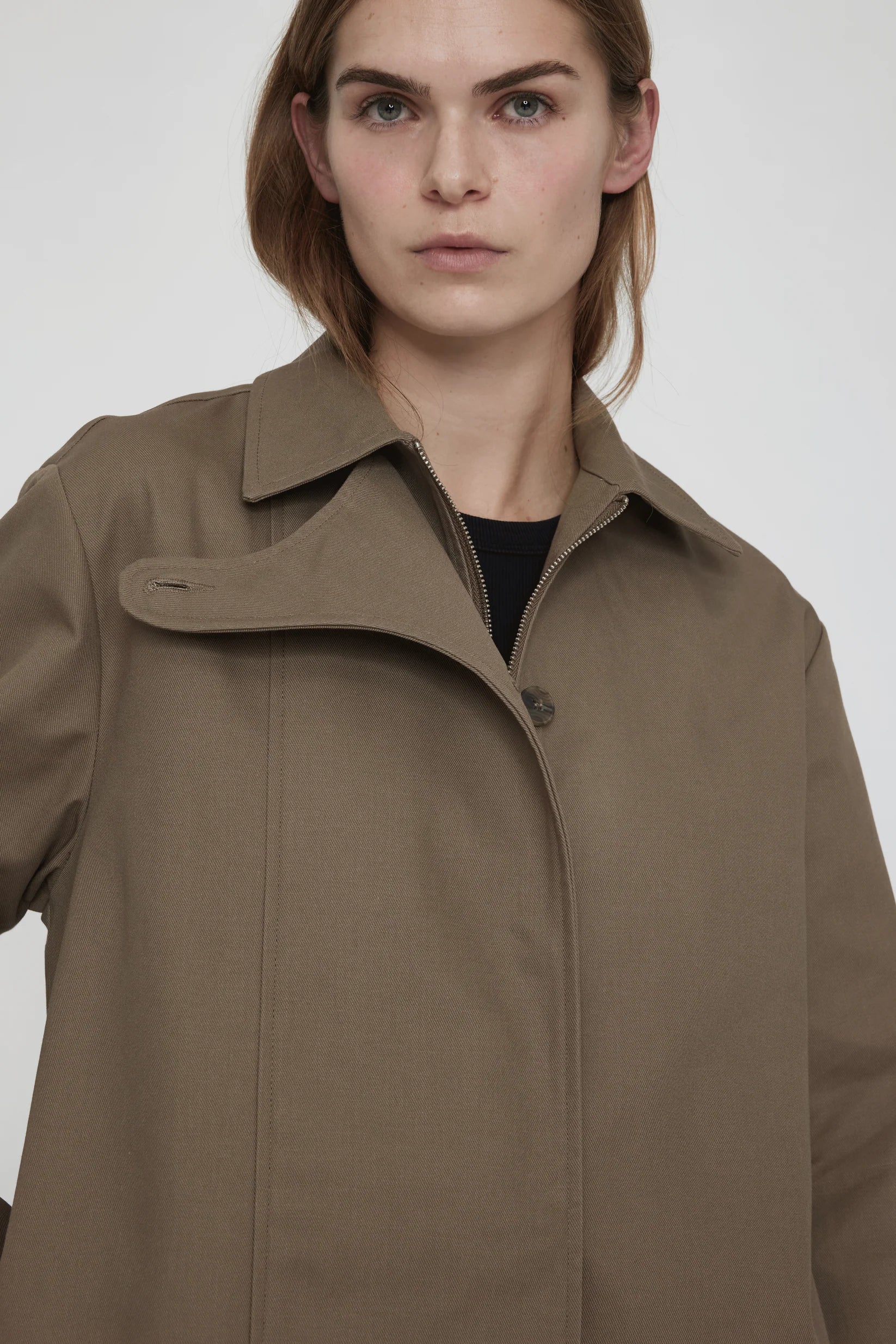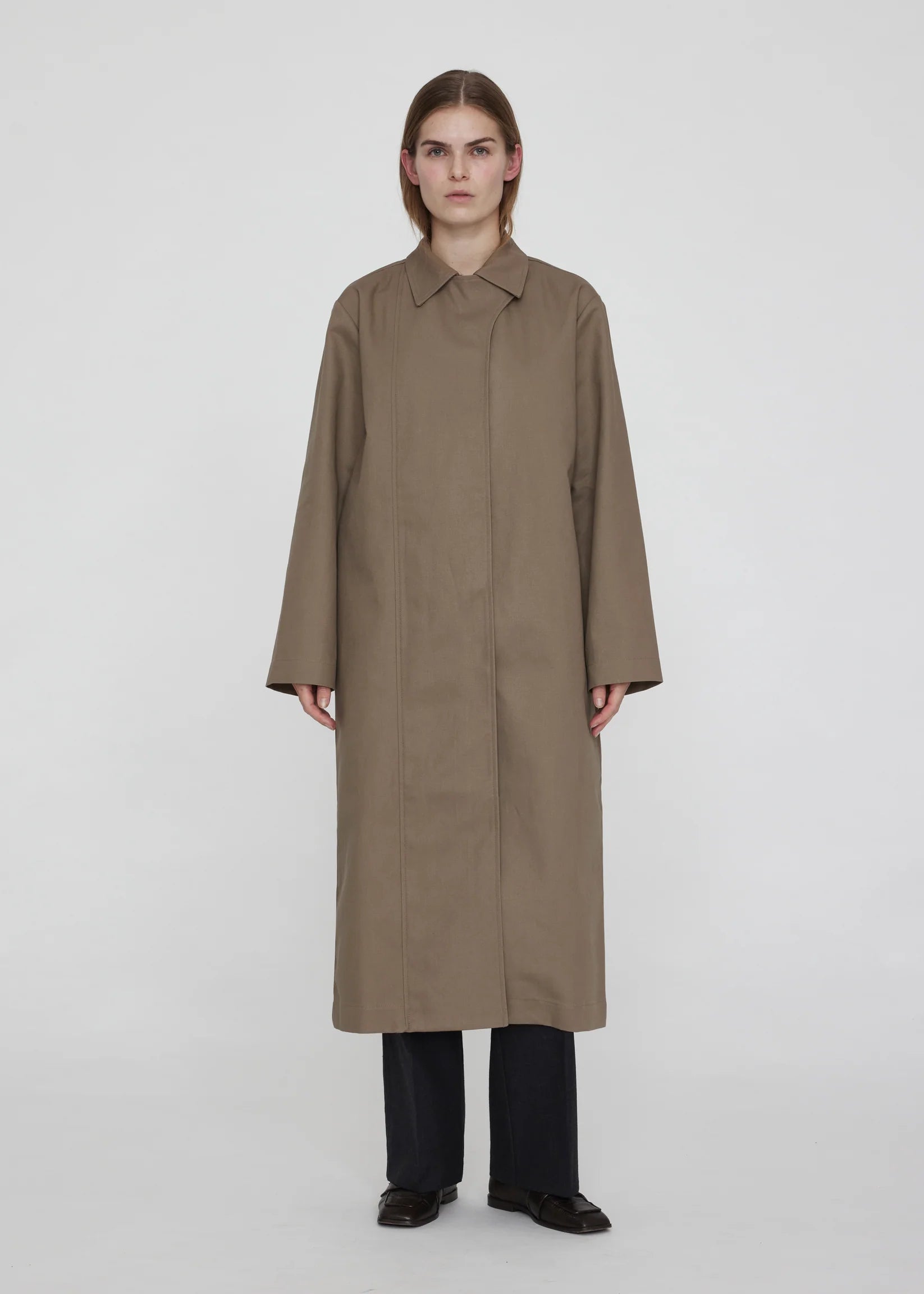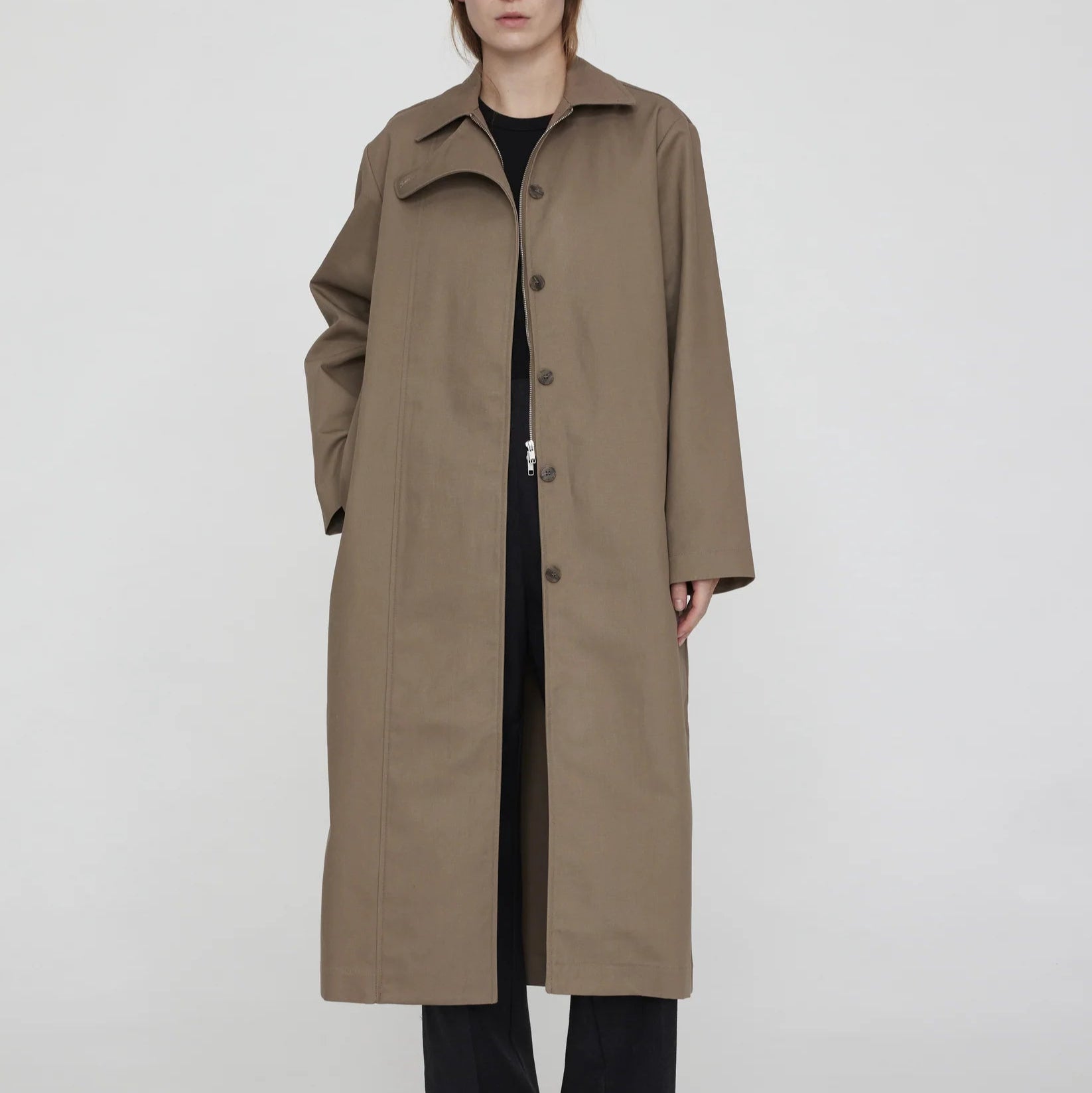 Arch Coat er en lang frakke i dark taupe lavet i en bomuld/polyester blanding, som er et overskudsmateriale fra en produktion i Europa.