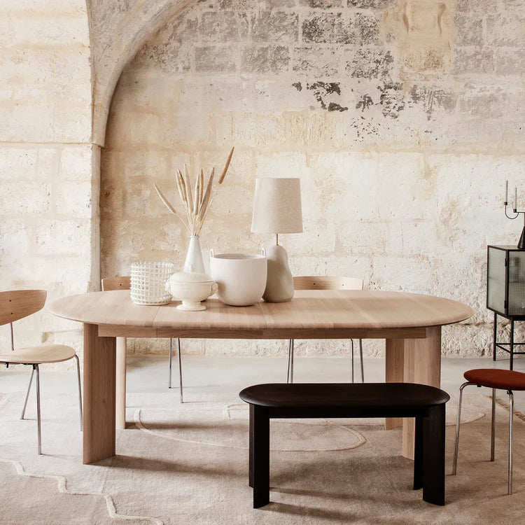 De brede, skulpturelle ben på vores runde Bevel Bord, som er lavet udelukkende af massivt, FSC®-certificeret egetræ, giver en moderne kant til det ellers klassiske design. Det fås enten med en naturlig olieret eller sort olieret finish og med en tillægsplade til at udvide bordpladen, så der er plads til flere gæster. Både bordpladen og benene har enkle detaljer med blidt afrundede kanter for at give et blødt udtryk. Et femte ben giver ekstra støtte, når tillægspladerne er i brug. Holdbare materialer og en tidløs silhuet gør Bevel-bordet til et uundværligt supplement i ethvert moderne hjem.