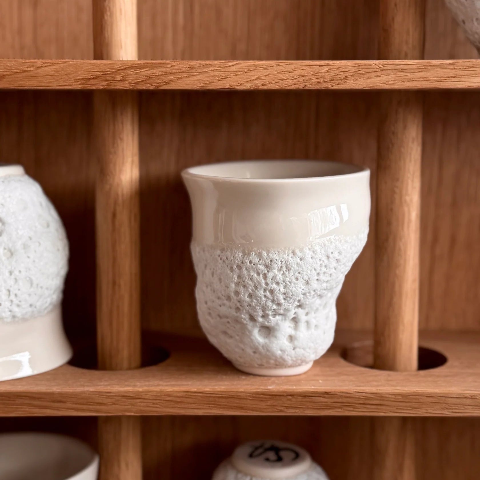Effektglasuren kan være sart på grund af hulrummene og boblerne. Glasuren er mat og kan og vil smuldre i skummet så derfor er der ikke garanti på skum glasuren. Det er det levende og smukke ved koppen, at den mærkes af livet lige som naturen forandres.