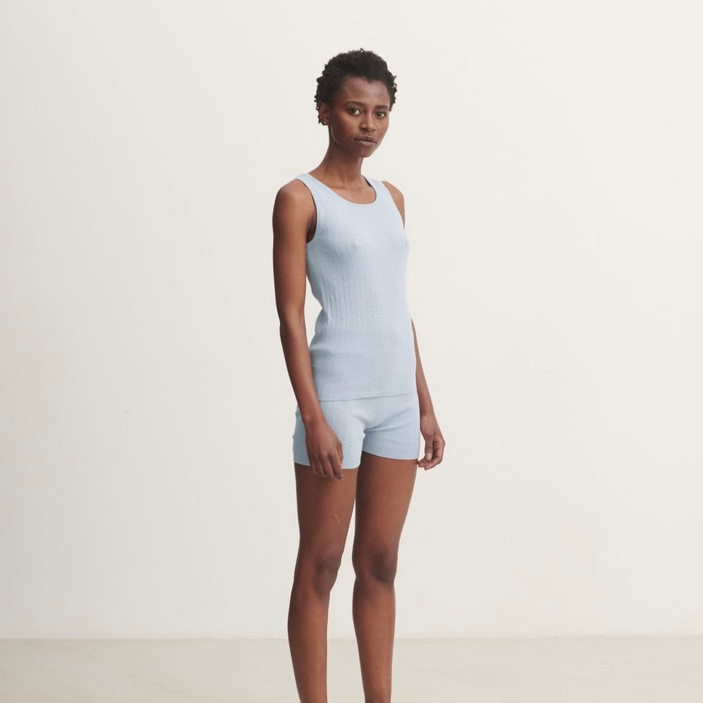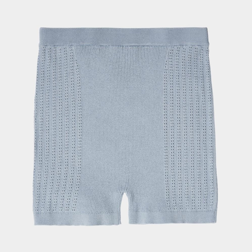 Denne strikkede sommerbrief i blød økologisk bomuld er designet med ribkanter og elastikkant i taljen, der sikrer en komfortabel pasform. Den er strikket i et fint rib- og pointellemønster.