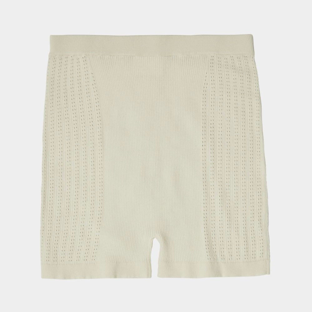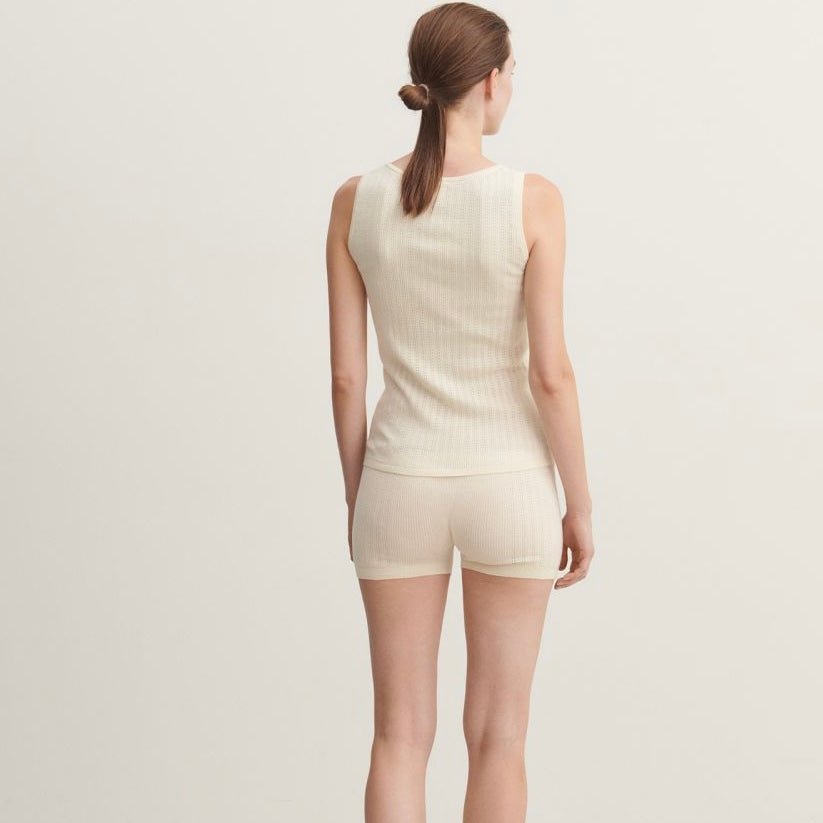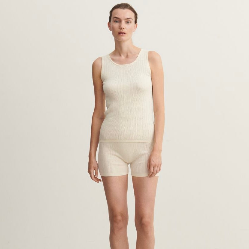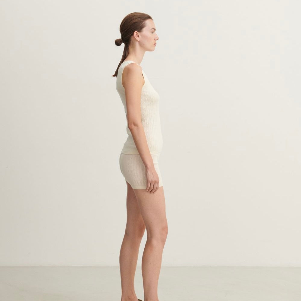 Denne strikkede sommerbrief i blød økologisk bomuld er designet med ribkanter og elastikkant i taljen, der sikrer en komfortabel pasform. Den er strikket i et fint rib- og pointellemønster.