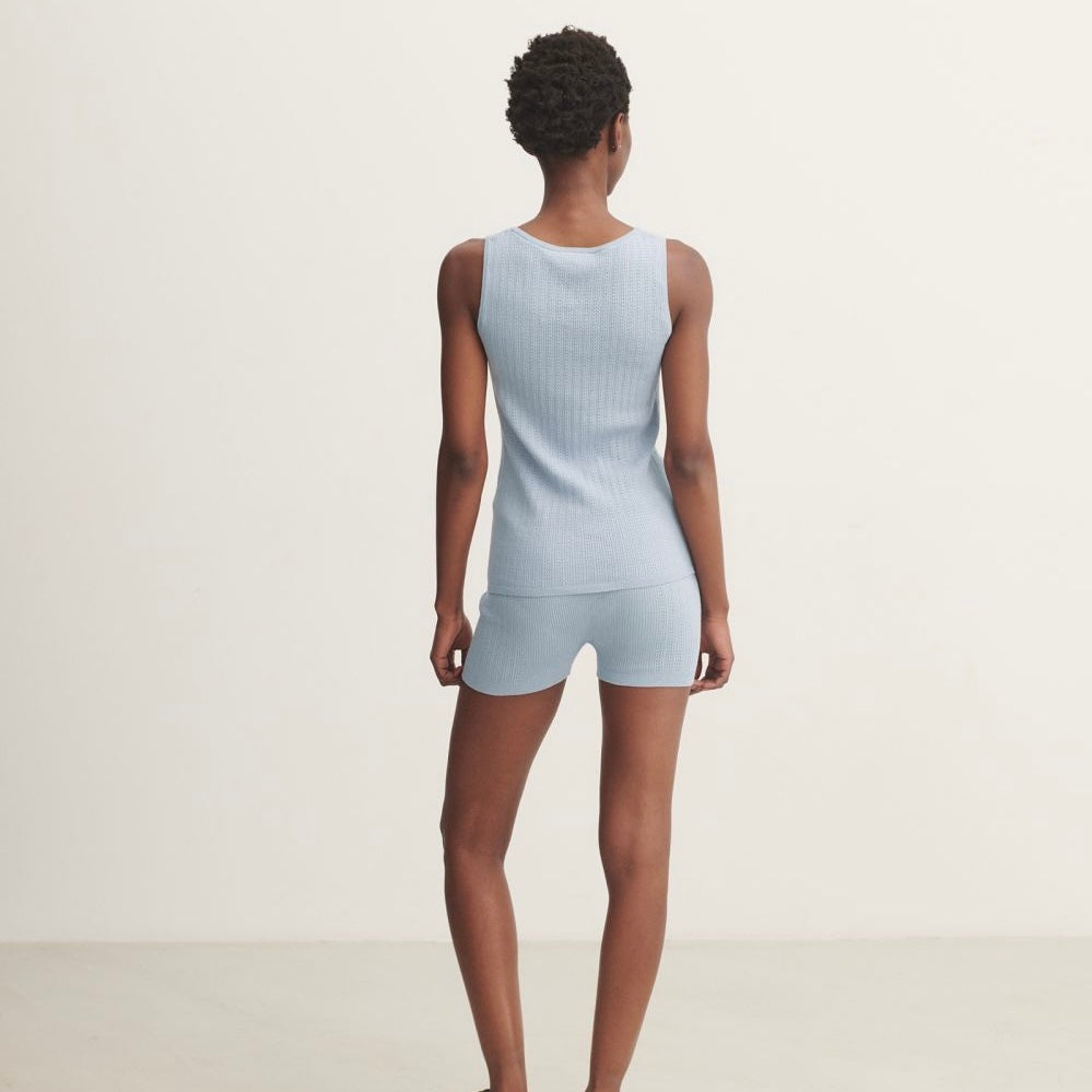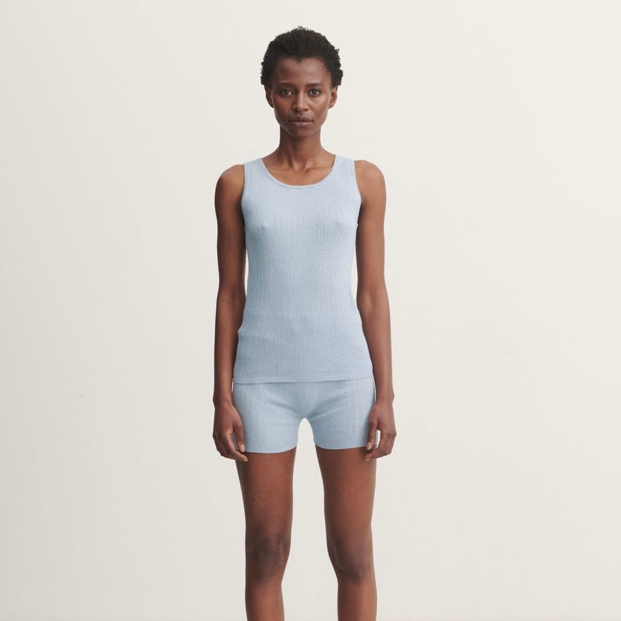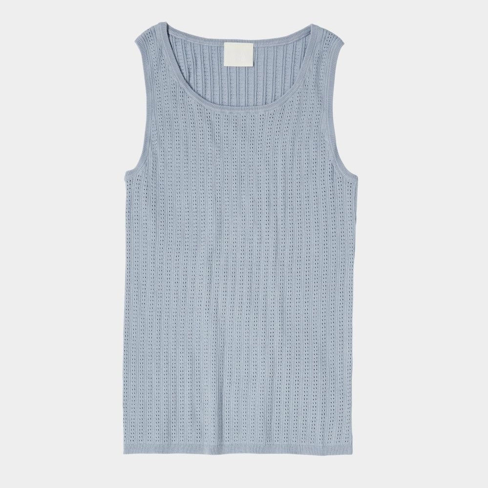 Denne undertrøje er strikket i blød økologisk bomuld og designet med smalle ribkanter ved hals og ærmegab. Undertrøjen har en smal pasform og er strikket i et fint rib- og pointellemønster. Brug den som en top eller som et ekstra lag.
