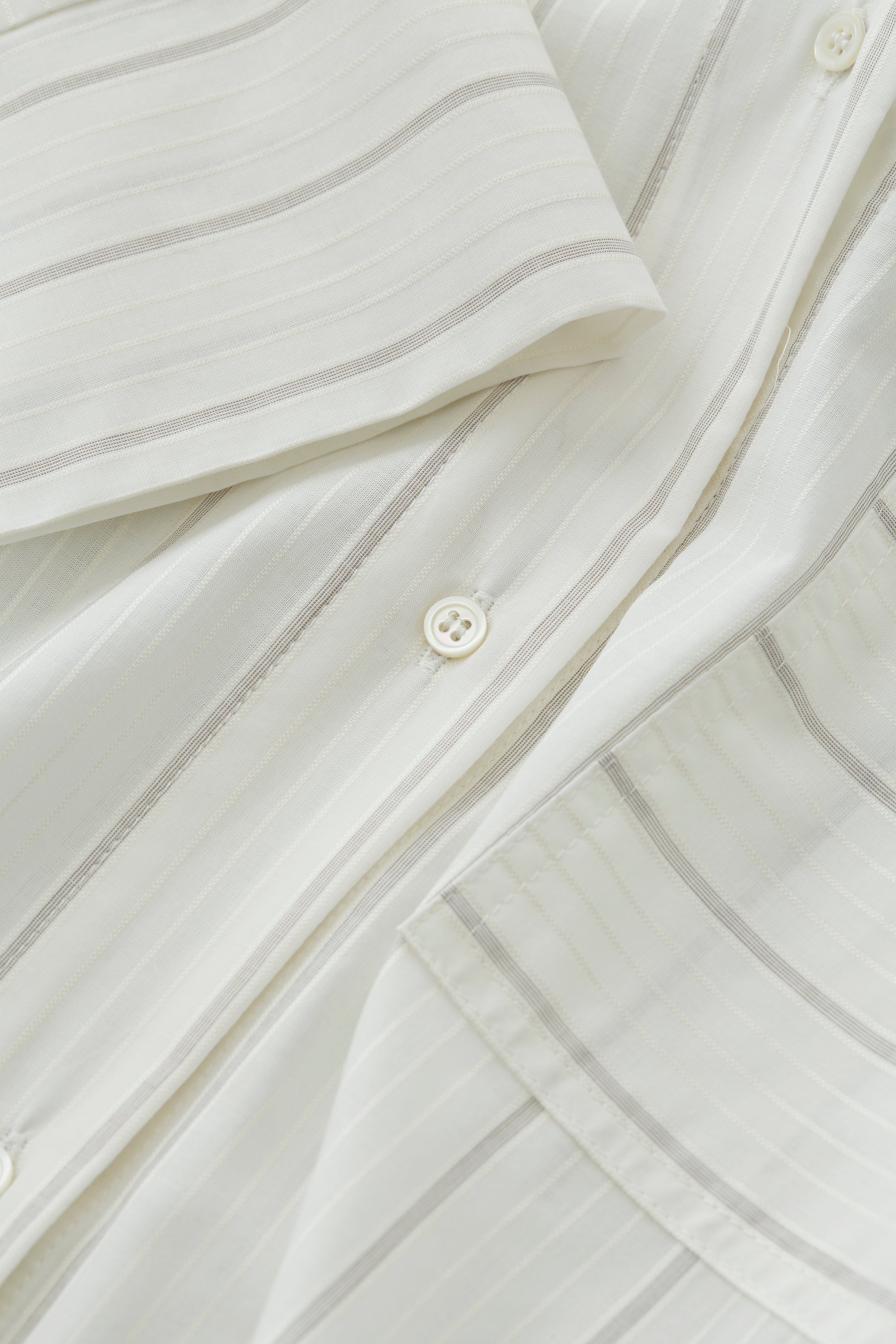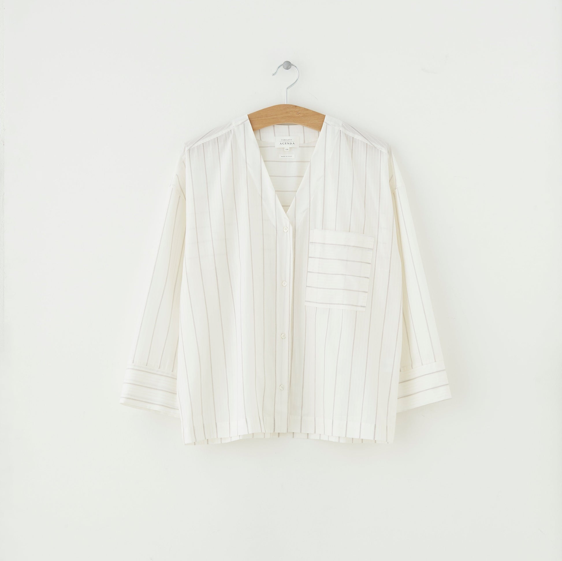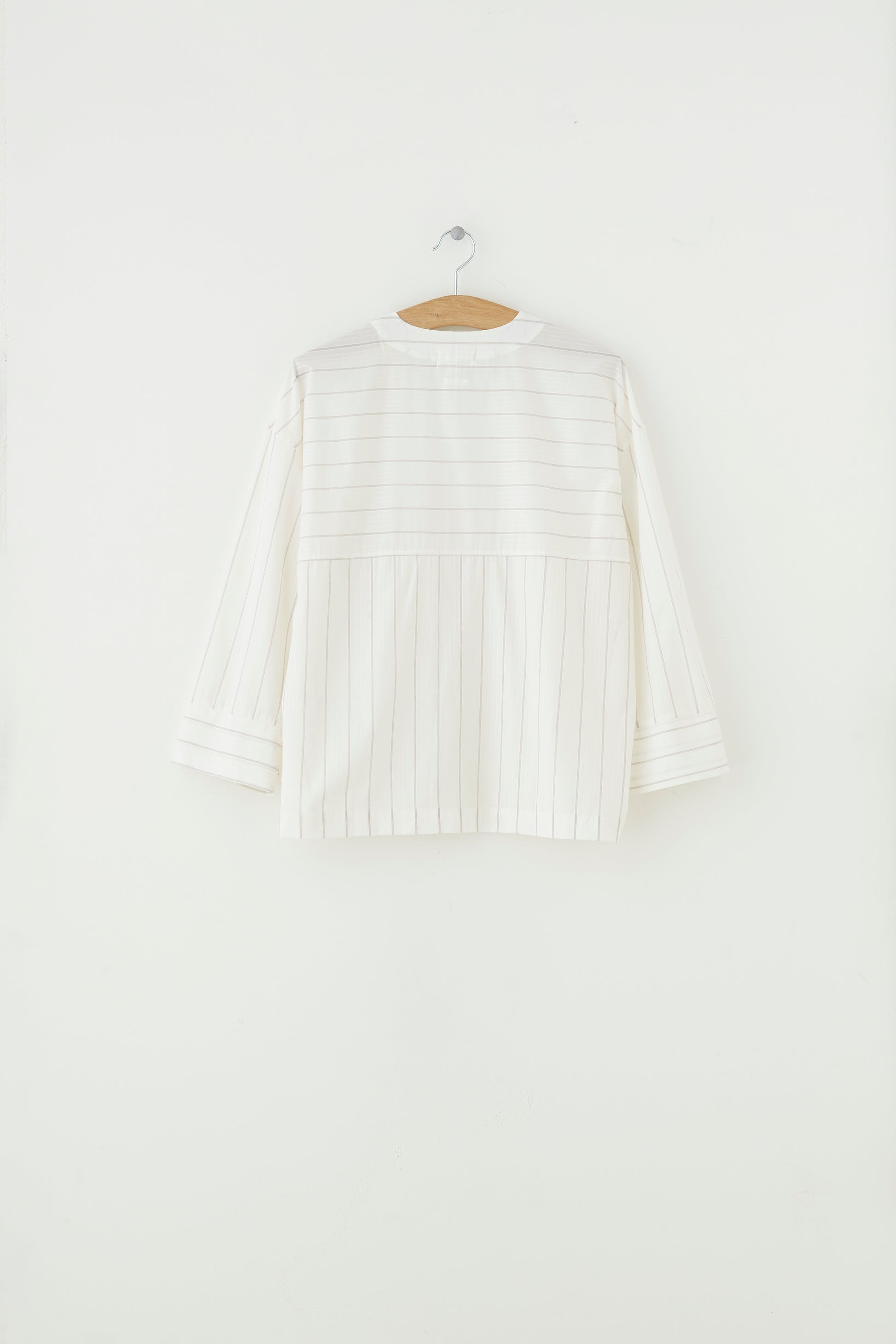 This Edit shirt is made in a thin cotton fabric with a subtle shiny yarn dyed stripe. It has a loose fit, v-neckline with buttons center front and a straight wide sleeve. Shoulders are slightly dropped for a casual look.