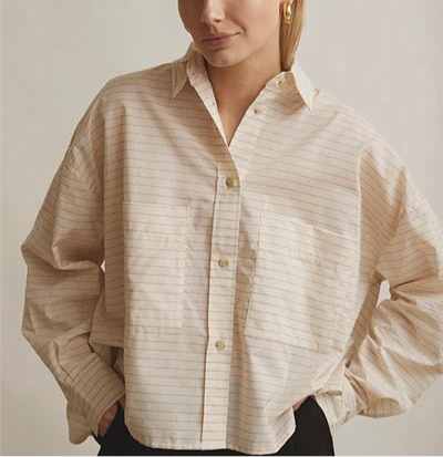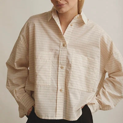 Froja-skjorten er lavet af 100% blød bomuldsvoilekvalitet. Stoffet har en fin lodret stribe med en cremet og rosa tone. Skjorten har en fuld stolpelukning foran, lige kant forneden og oversize lommer. Pasformen er oversized og let cropped. Style med dine yndlingsjeans eller elegante sorte bukser.
