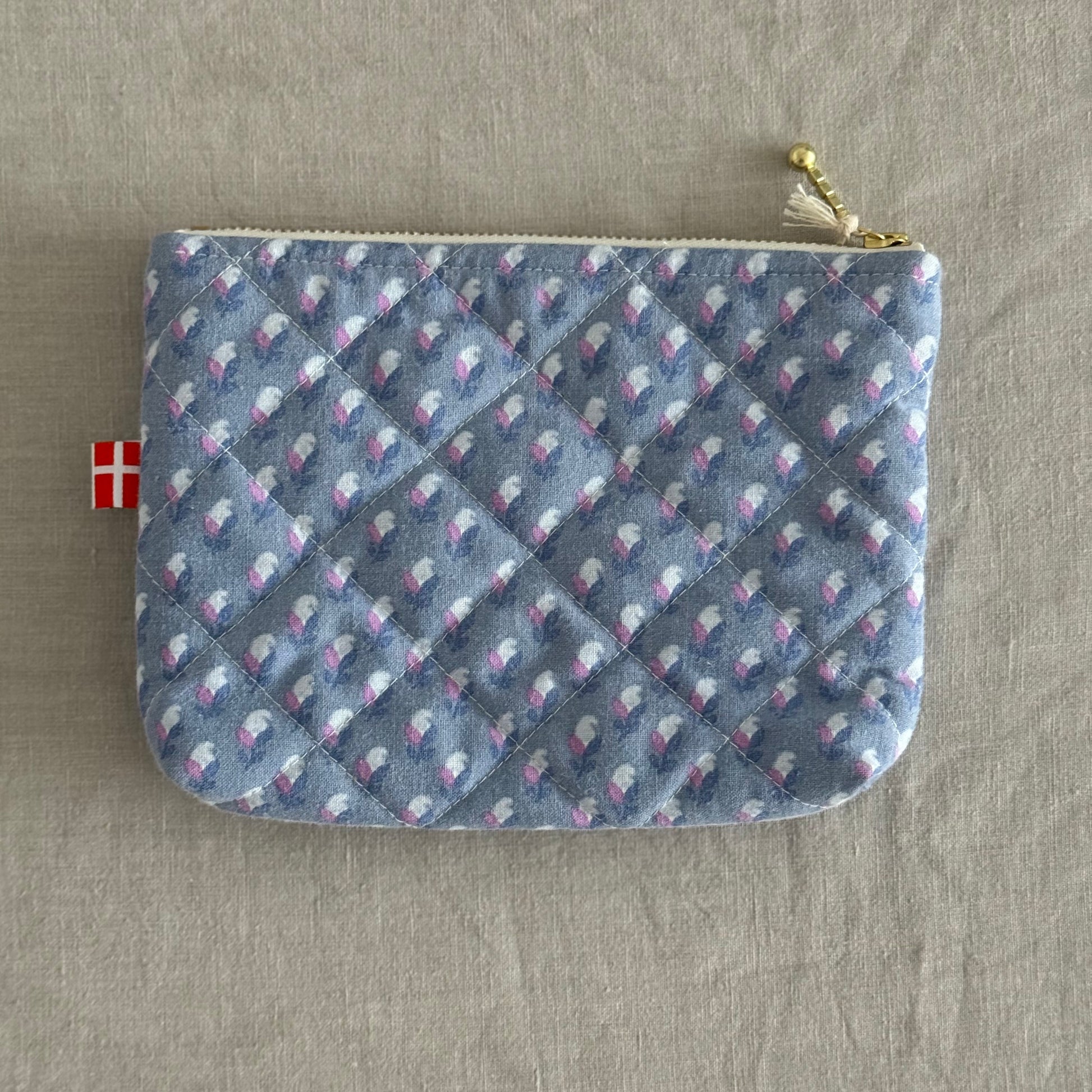 Håndsyet Makeuppung/Pung i upcyklet stof, Blå m. Lilla/blå/lyseblå blomst - Vita Vass