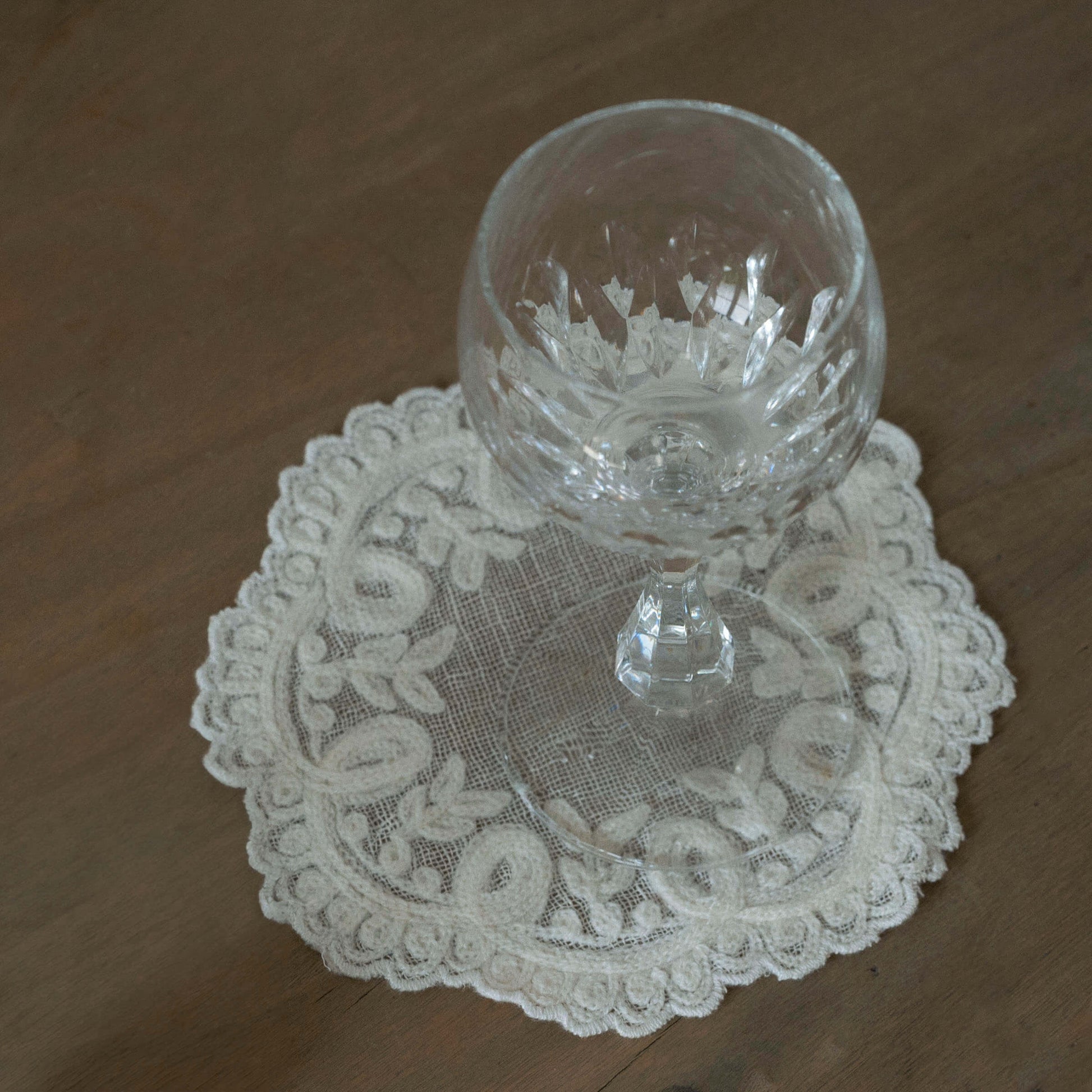 En fin lille 'coaster' med smukt blondemønster – perfekt under et glas vin, en kop kaffe eller som en dekorativ detalje på bordet. Den sarte blondekant og det klassiske mønster giver et nostalgisk og feminint udtryk, der passer smukt ind i både moderne og romantiske hjem. Brug den alene eller i sæt for at skabe en hyggelig og personlig borddækning.