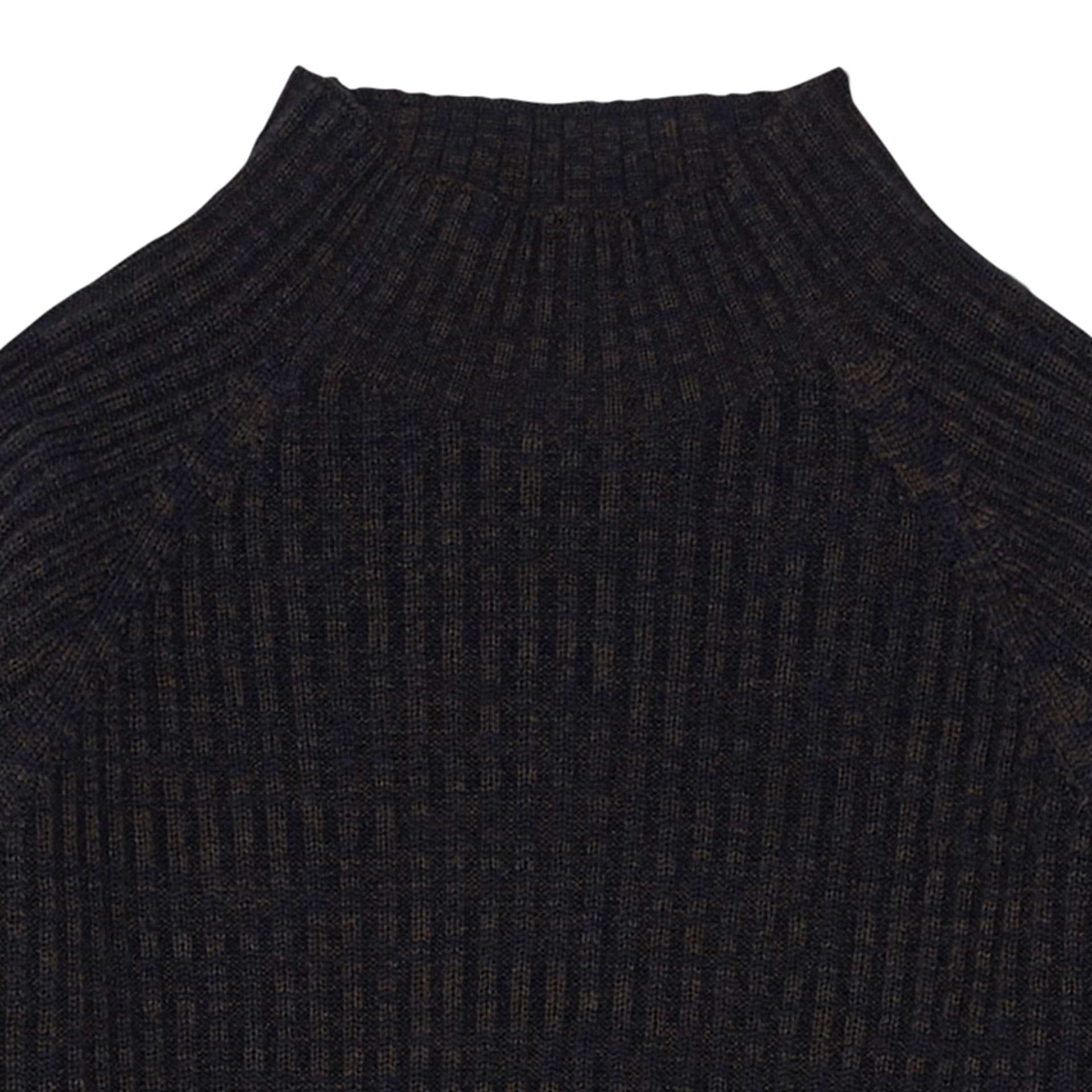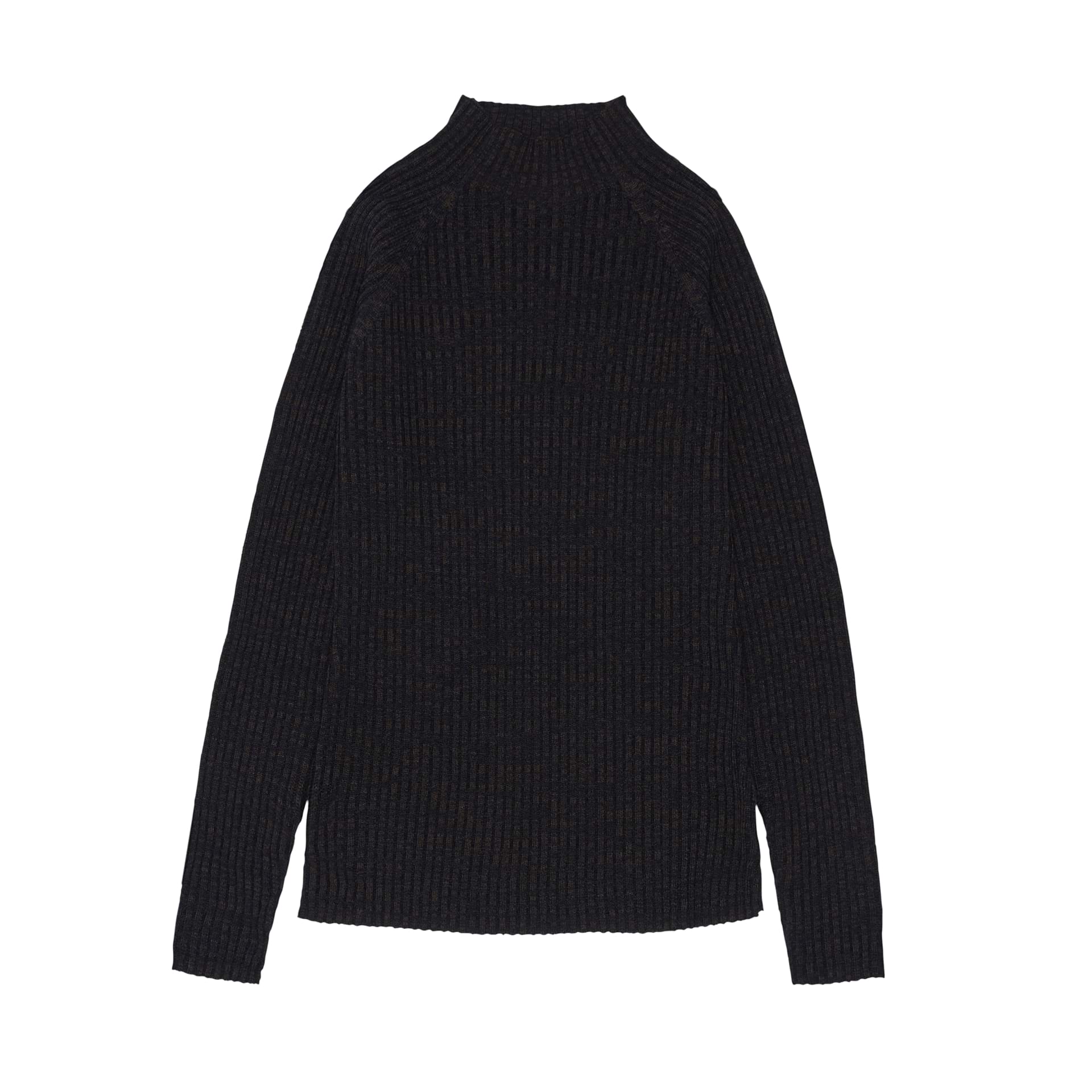 Denne bluse i finstrikket merinould har raglanærmer, høj hals og en smal pasform. Blusen er strikket i en tofarvet melange ribstruktur. Vores merinould er fri for skadelig kemi og kommer fra mulesing-fri får.