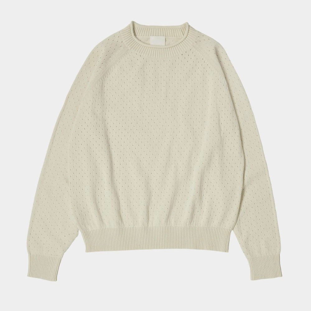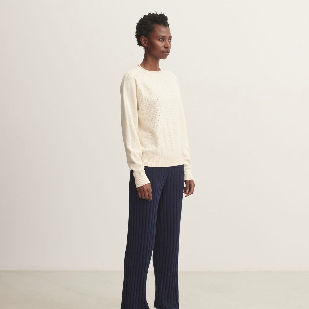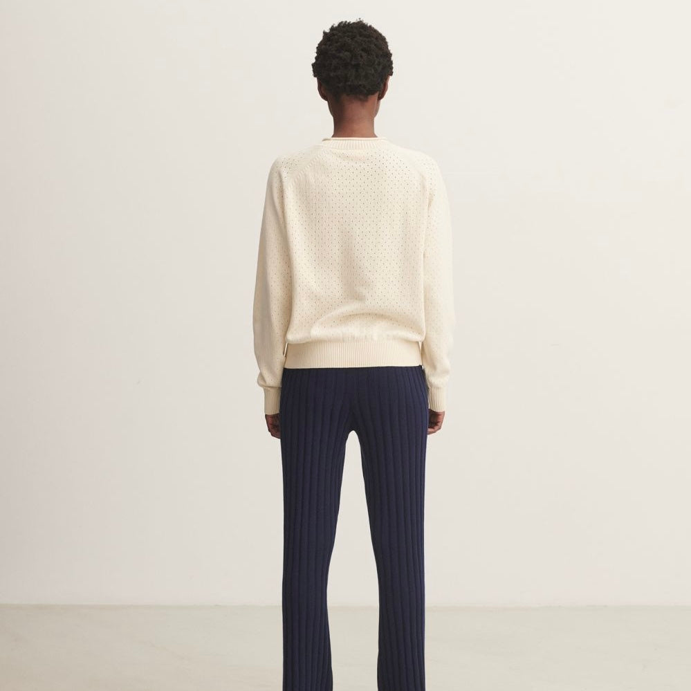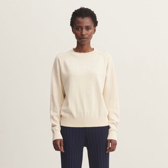 Denne rundhalsede sweater i økologisk bomuld har bred ribstrikket hals med rullekant, raglanærmer og en løs pasform. Den er strikket i et enkelt pointelle mønster og har klassiske ribkanter. Sweateren er strikket i et high-twist bomuldsgarn. Dette garn er spundet hårdere end vores klassiske bomuld og giver stylen et fastere, skarpere og mere formstabilt udtryk.
