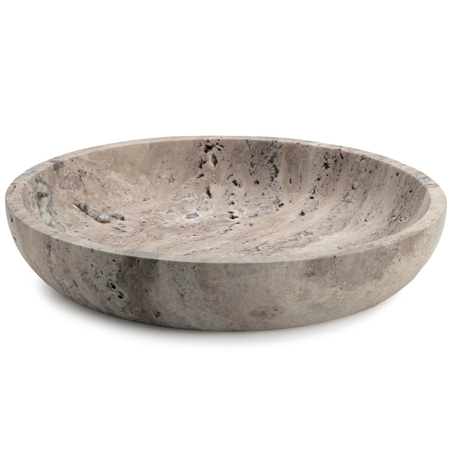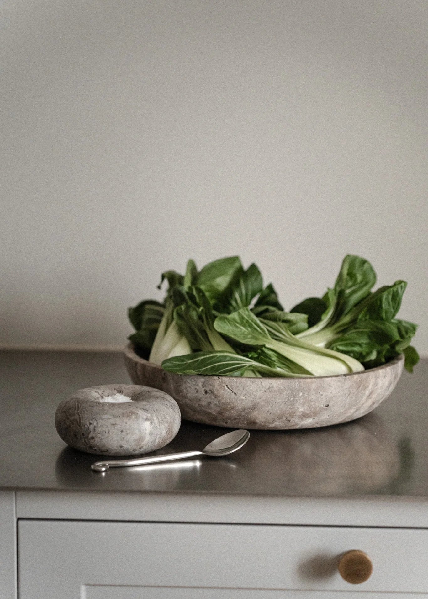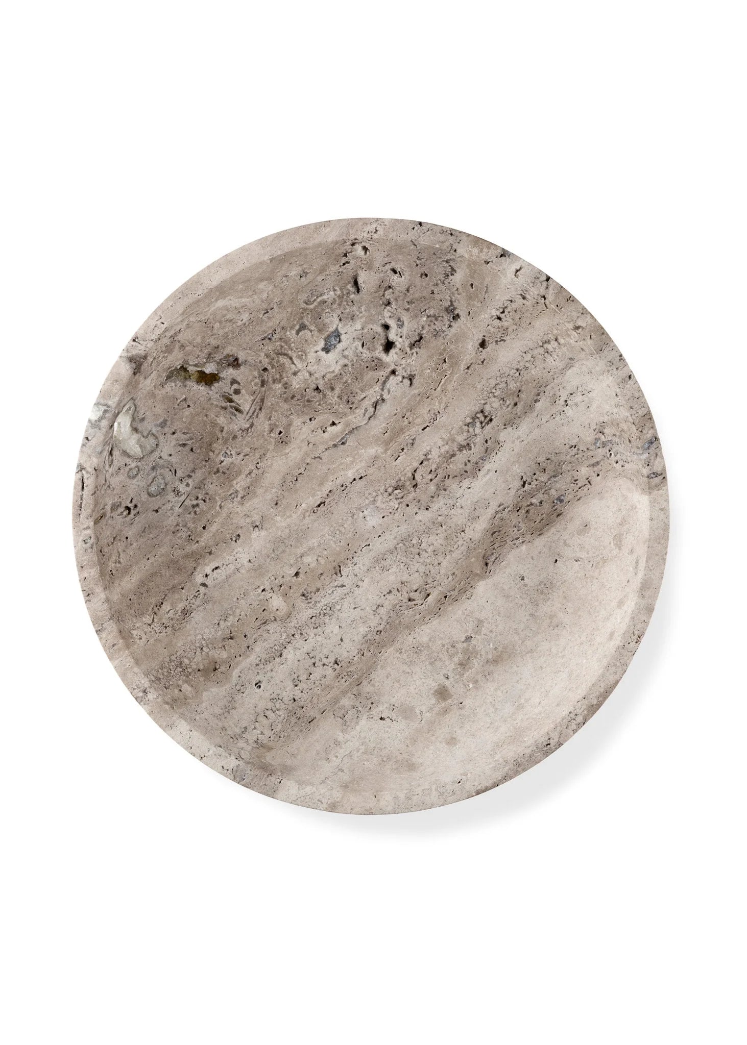 Skålen er håndlavet i den elegante kalksten travertin silver fra Europa. De grå og brune nuancer danner en neutral baggrund, mens små, fine hvide glimt tilfører liv og dybde til overfladen. De naturlige huller i stenen er bevaret, hvilket giver et råt og autentisk udtryk. Hver skål er unik og udstråler en underspillet elegance og stor håndværksmæssig finesse.