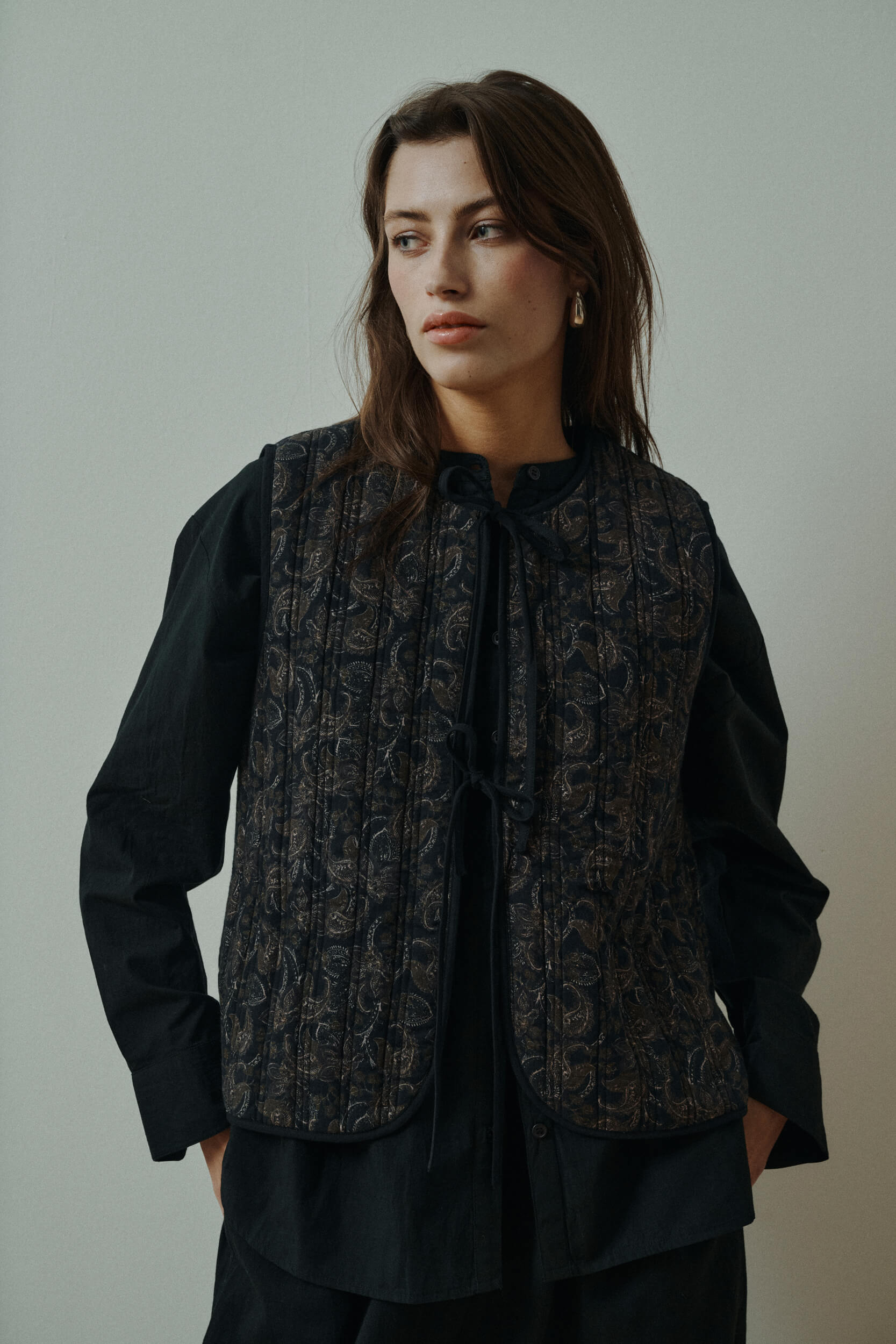 Blusen er designet med en dyb V-hals med kinakrave og bindebånd. Manchetterne er afsluttet med en knaplukning.