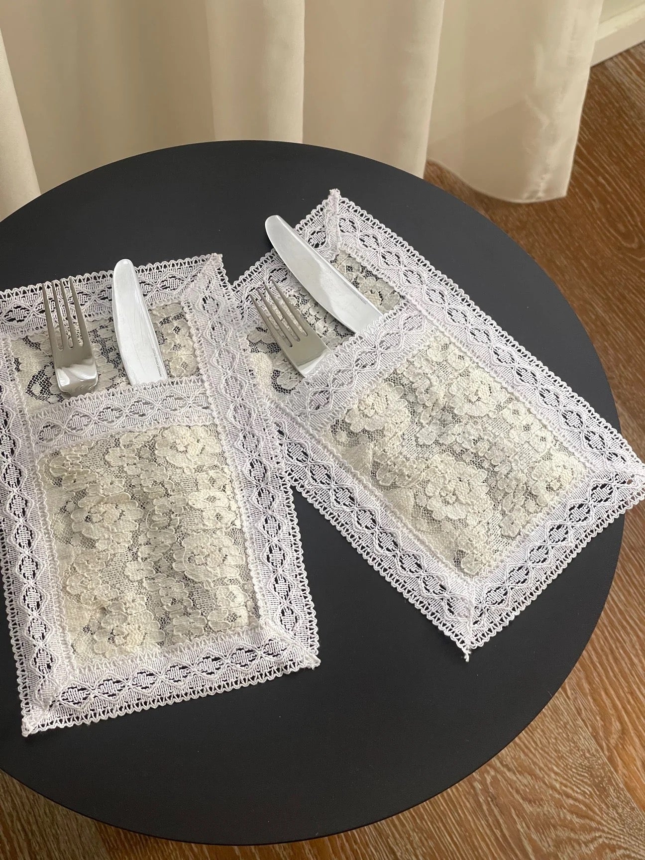 Disse smukke blondelommer til bestik er ideelle til dem, der ønsker en unik løsning til deres borddækning. De er lavet af blonder, hvilket gør dem bløde og naturlige at se på. De kan blandes og matches på tværs for et mere individuelt look. De kan skånsomt vaskes / kort program ved 30 grader. Vaskemidlet må ikke indeholde blegemiddel.