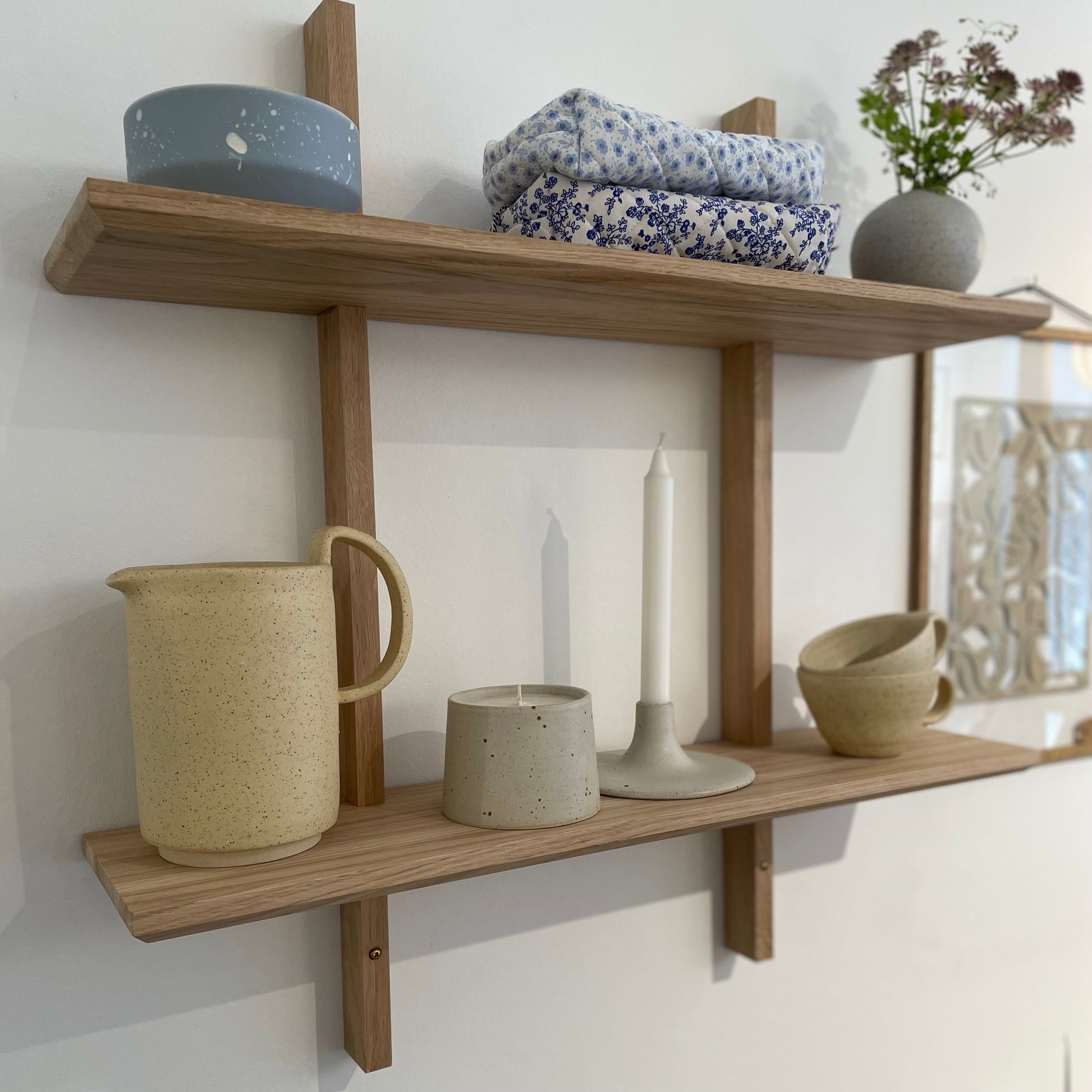 Smuk hyldesystem i massivt egetræ lavet af møbelsnedker Tue Frier.