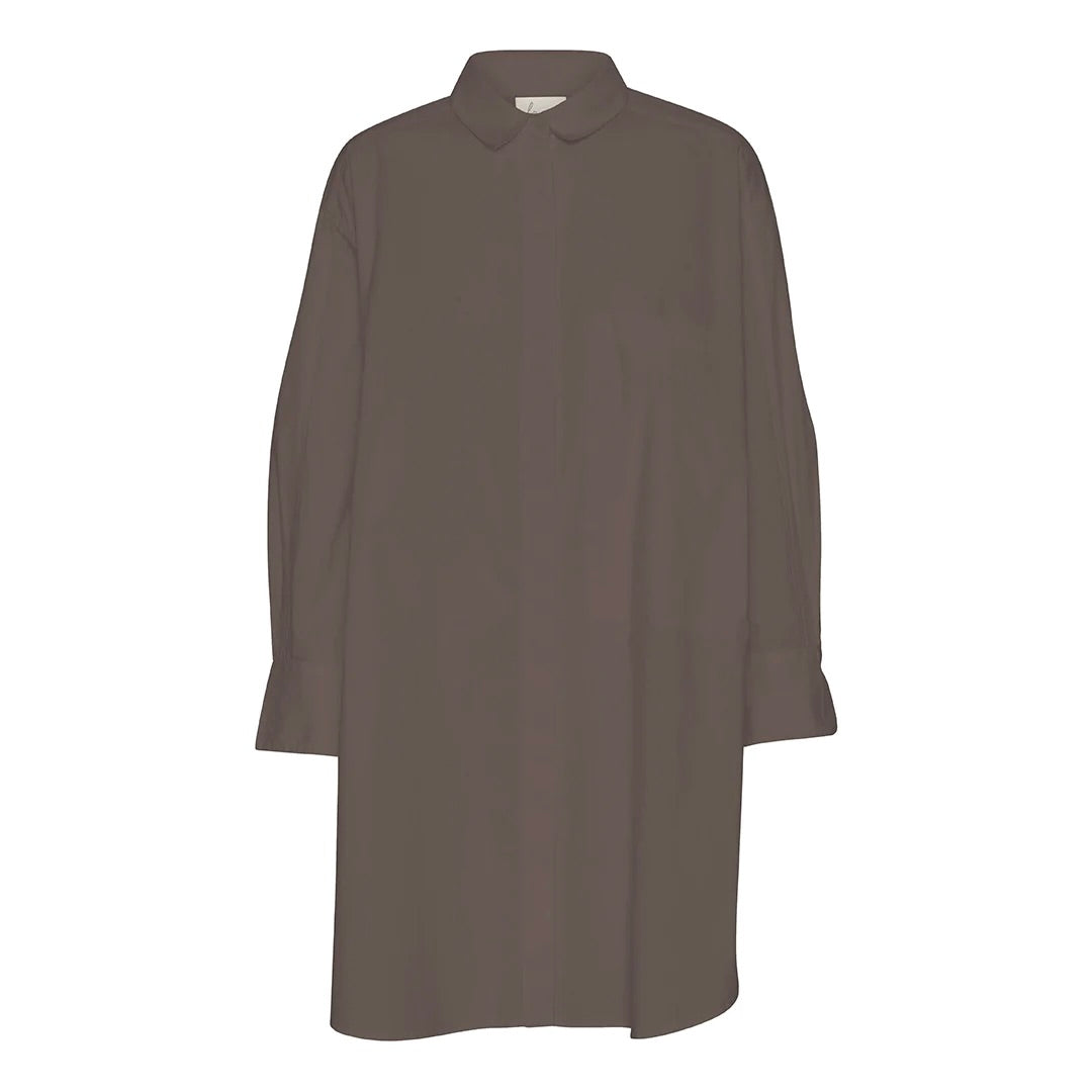 Gennemknappet, lang skjorte med masser af vidde. Skjorten har en stor brystlomme og lange ærmer, her i en flot brun farve.