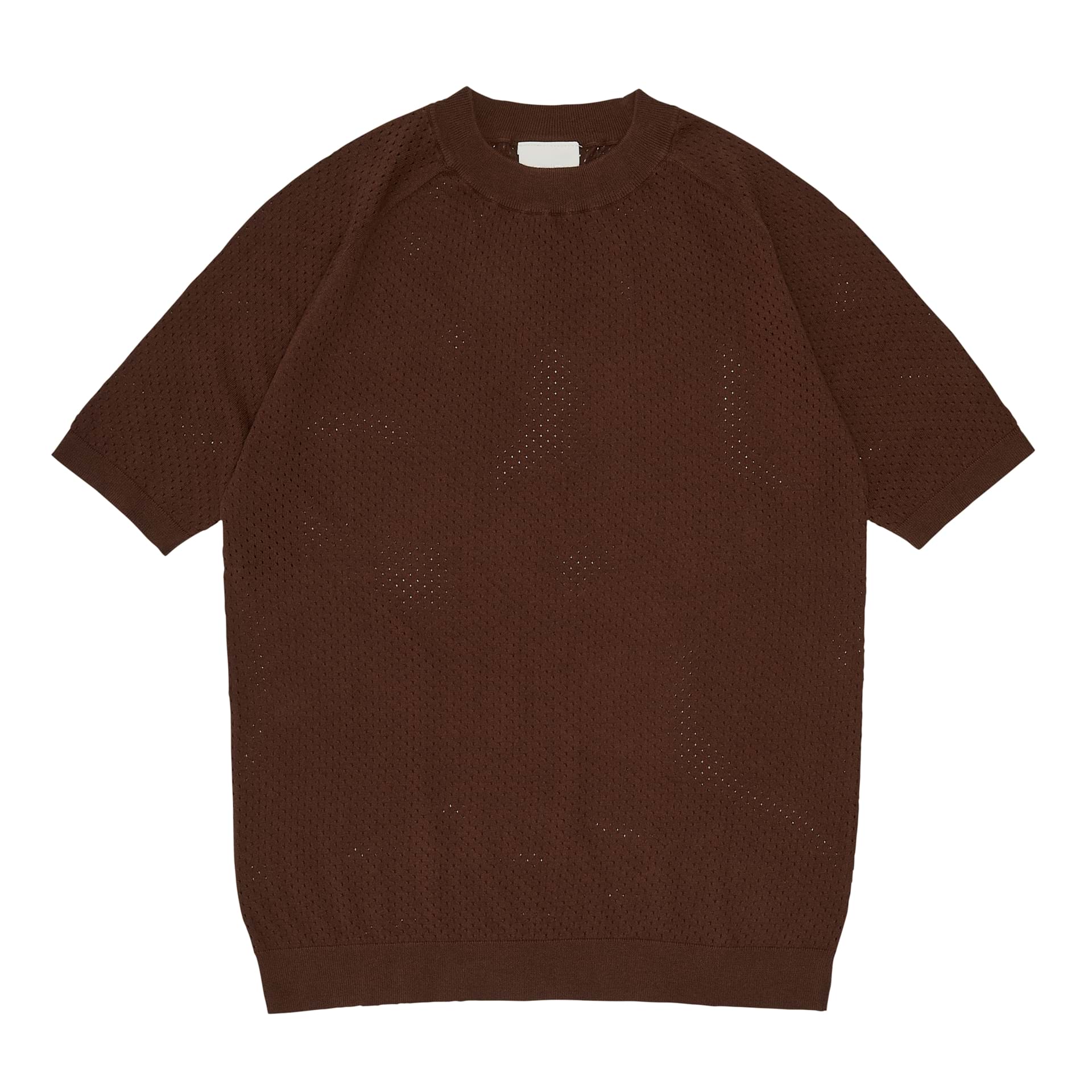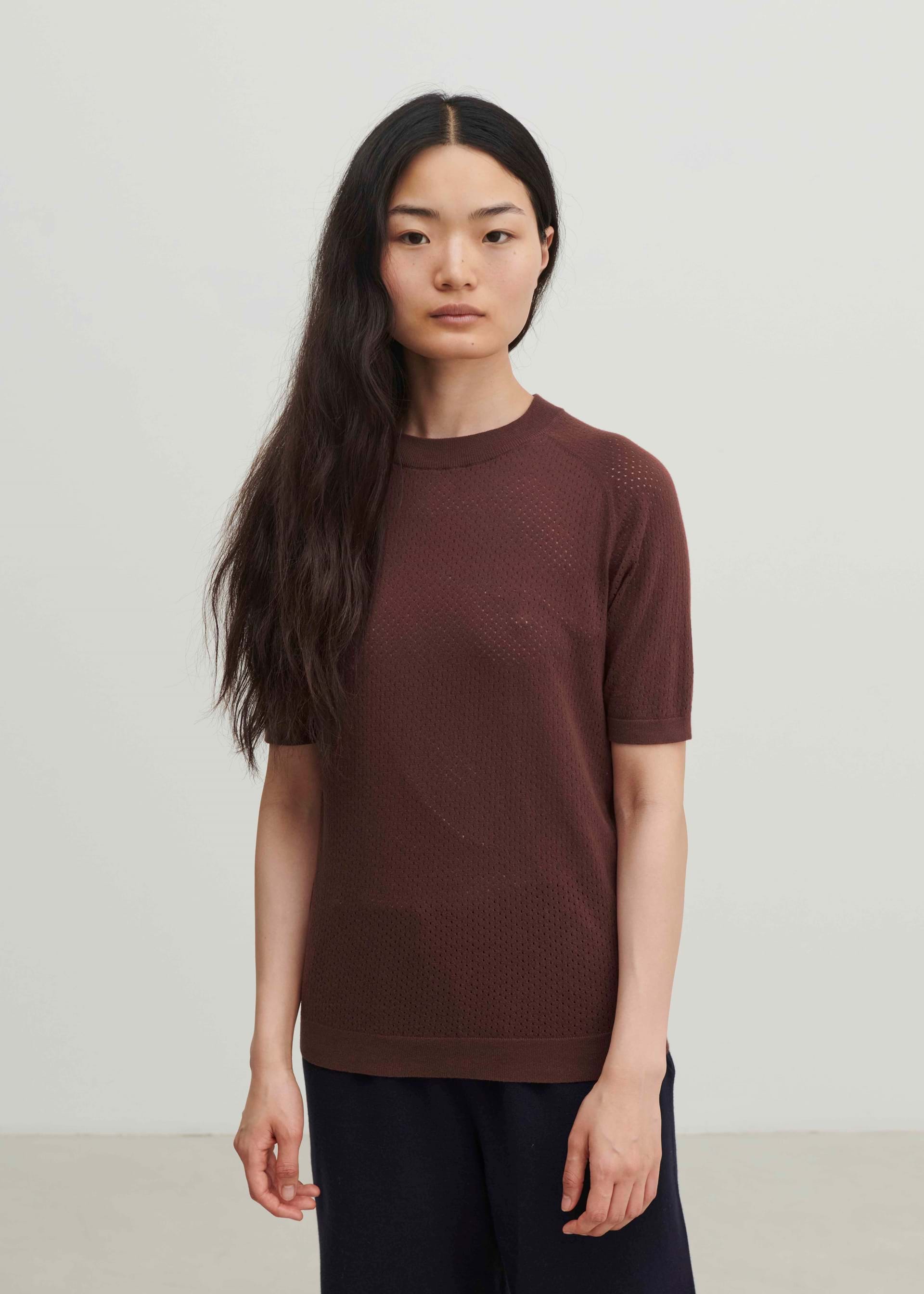 Denne T-shirt i økologisk bomuld er designet med saddle shoulder, rund halsudskæring og ribstrikkede detaljer ved krave og kanter. T-shirten har en regulær pasform og er strikket i et let, åbent pointelle mønster.