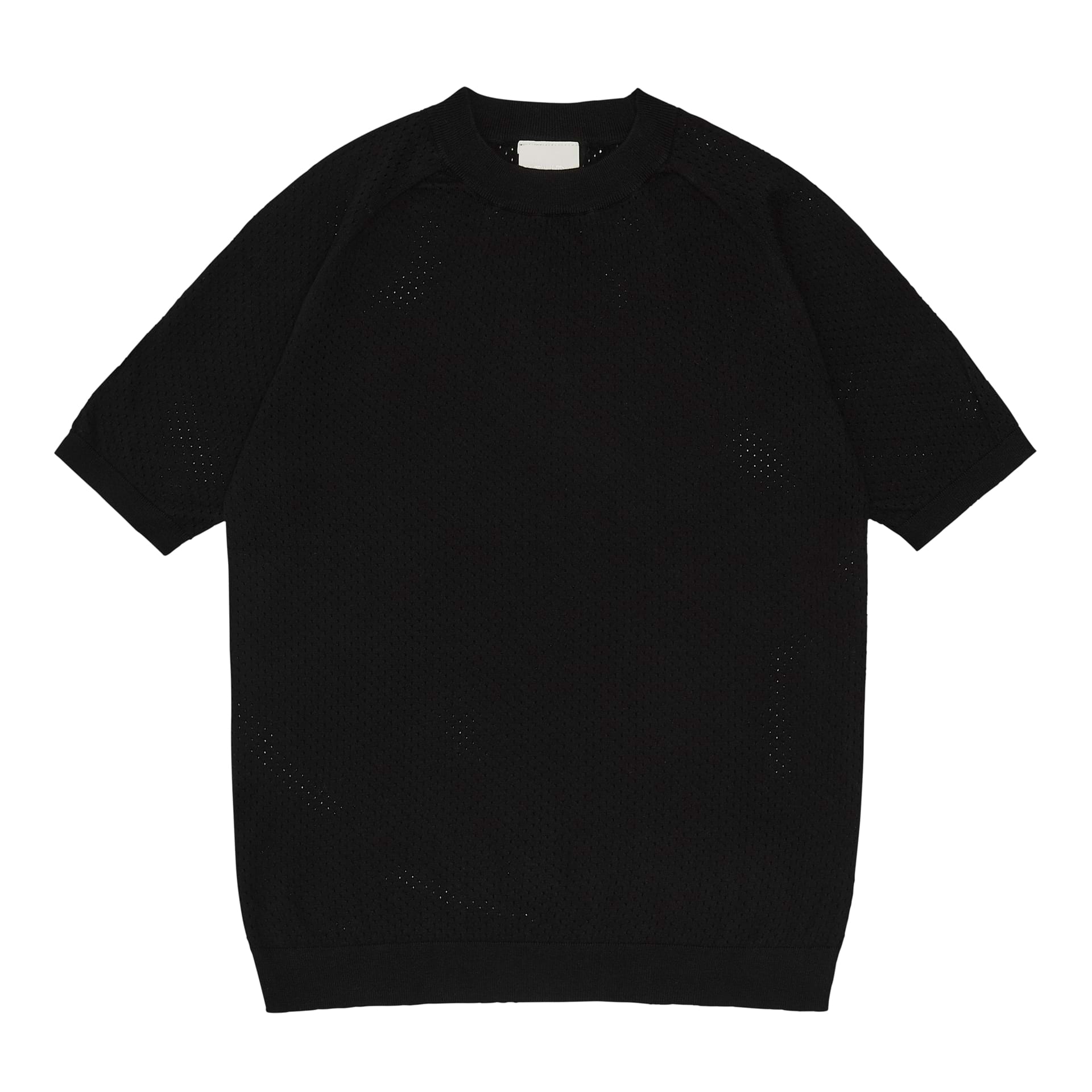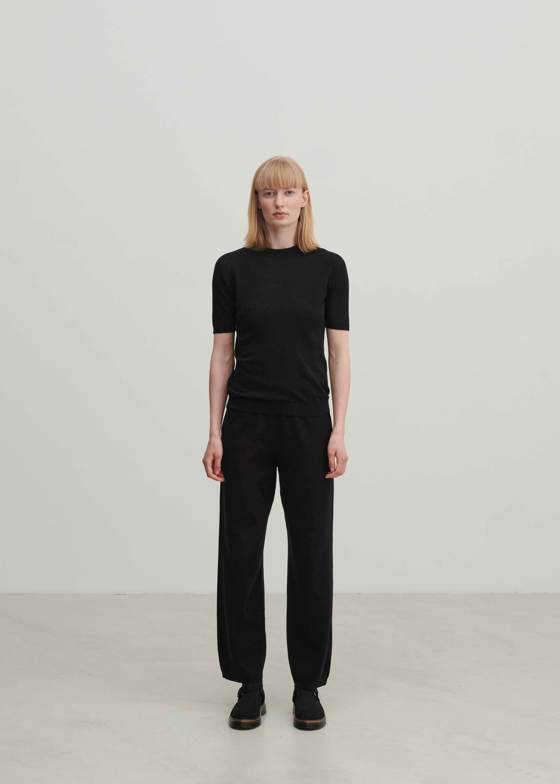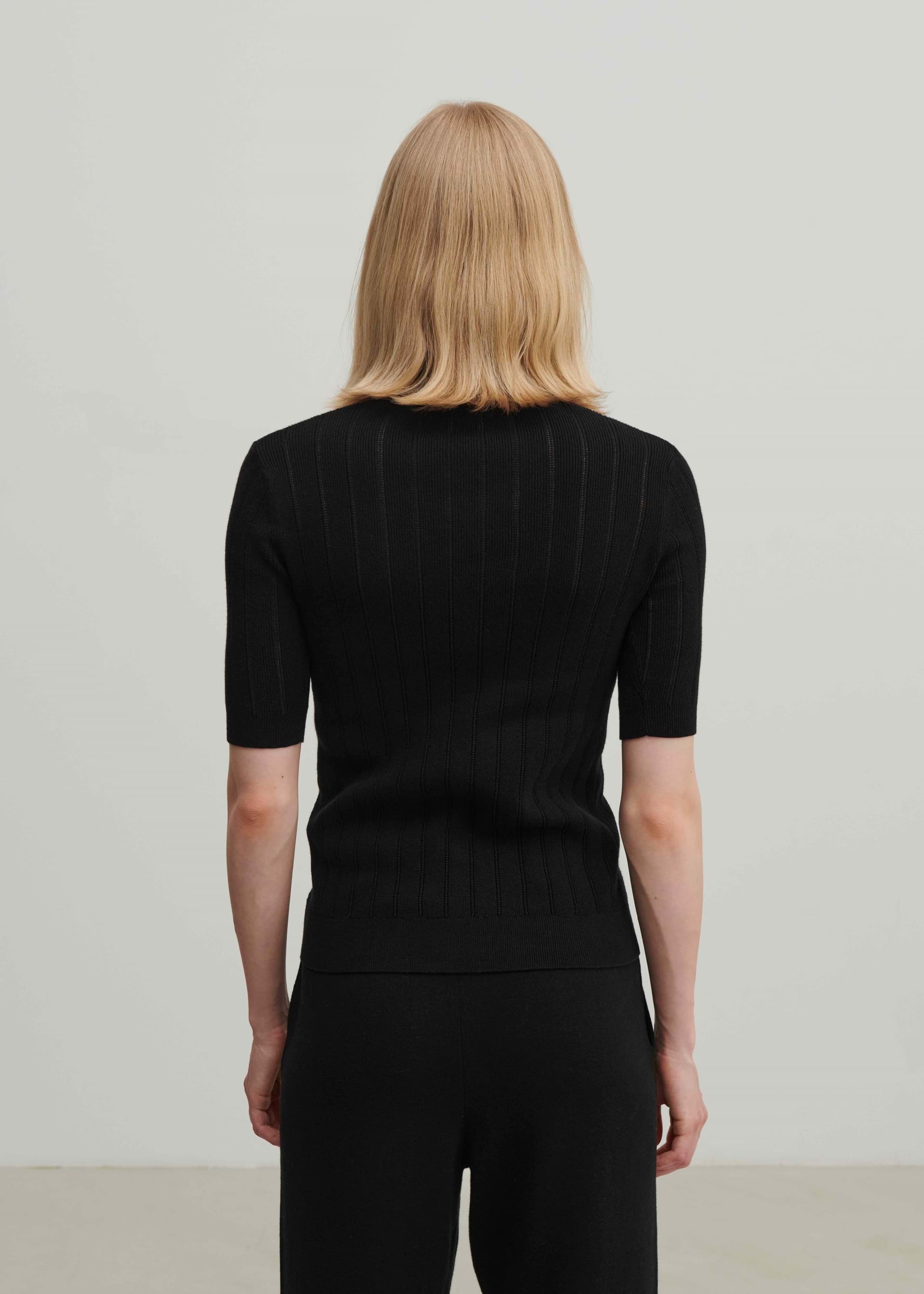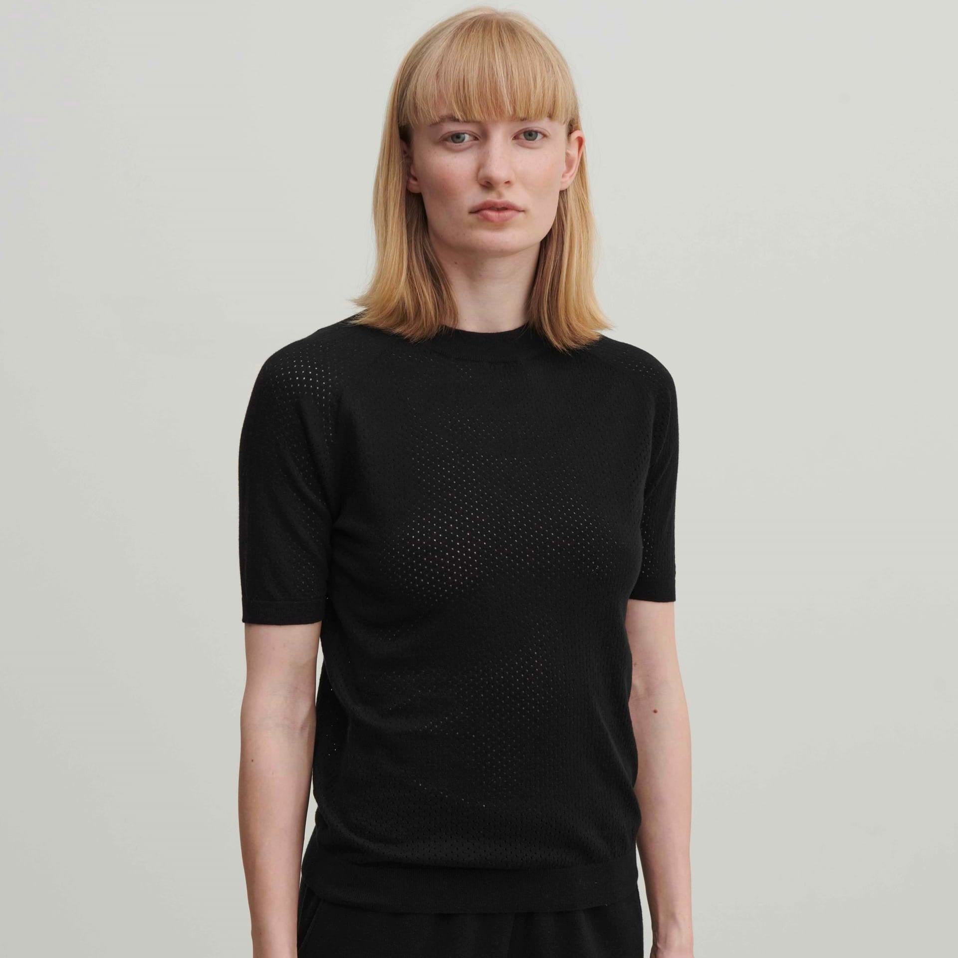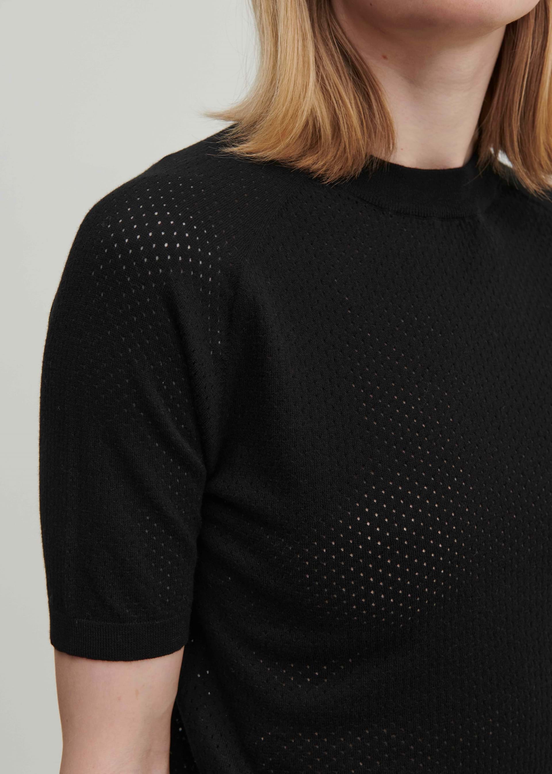 Denne T-shirt i økologisk bomuld er designet med saddle shoulder, rund halsudskæring og ribstrikkede detaljer ved krave og kanter. T-shirten har en regulær pasform og er strikket i et let, åbent pointelle mønster.