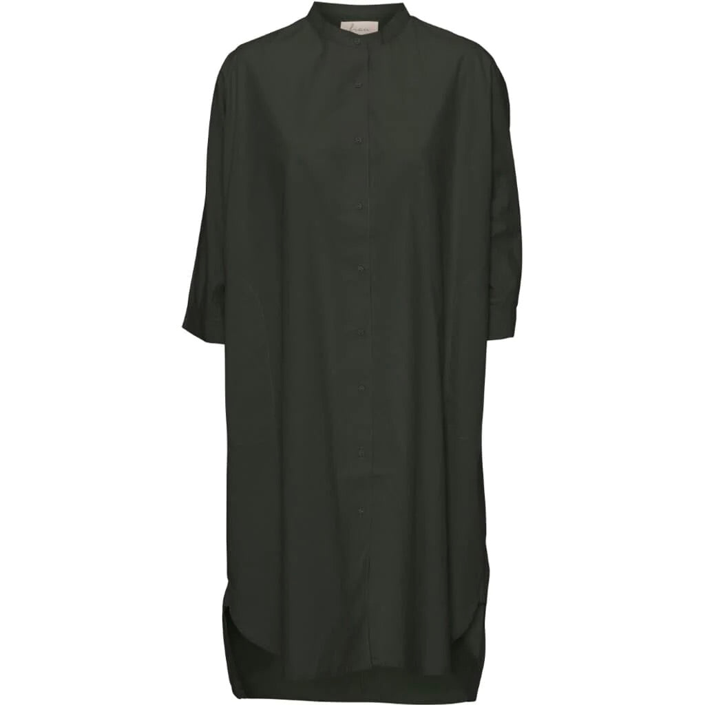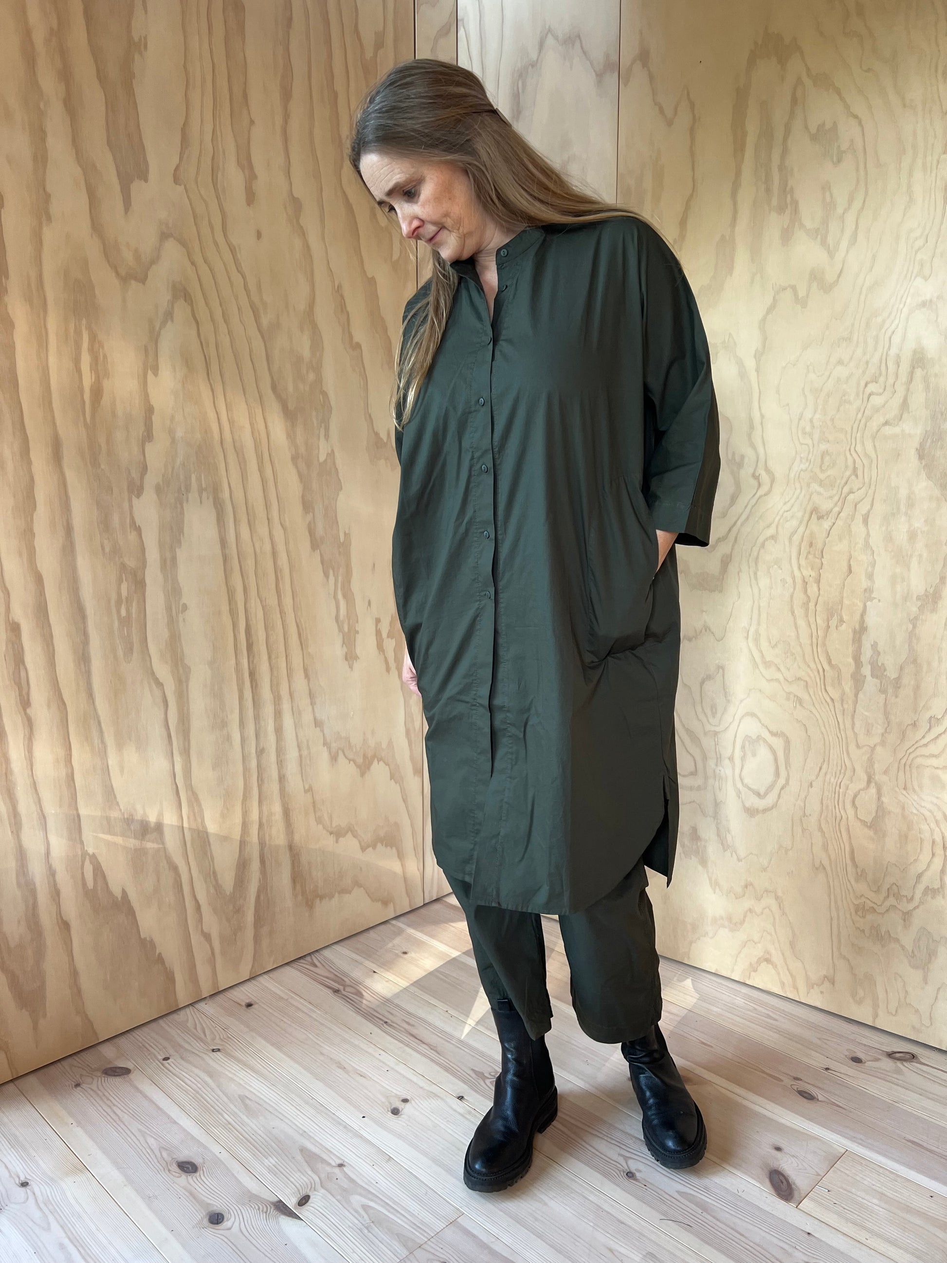 Oversize skjortekjole med 3/4 ærmer og kinakrave. Kjolen har sidelommer og er gennemknappet.