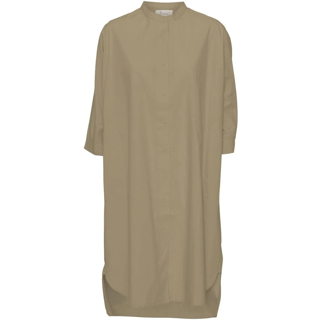 Sandfarvet oversize skjortekjole med 3/4 ærmer og kinakrave. Kjolen har sidelommer og er gennemknappet.