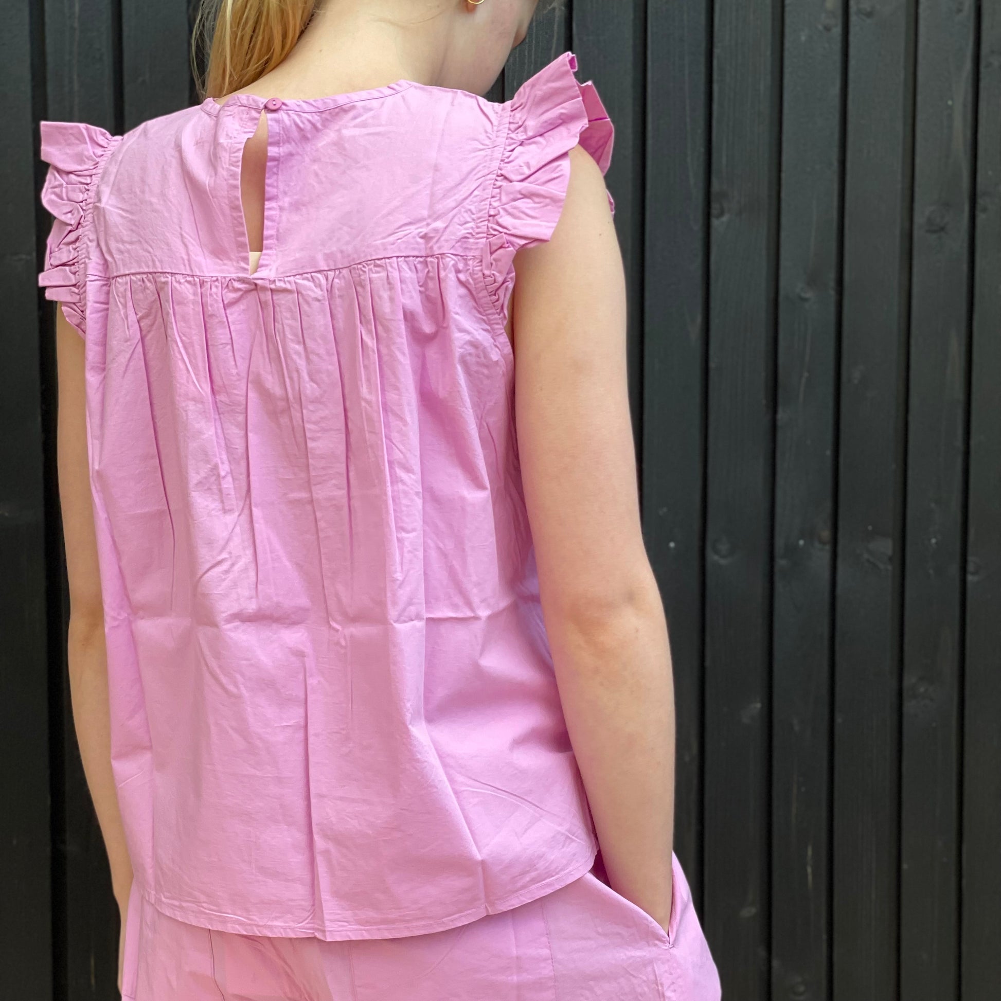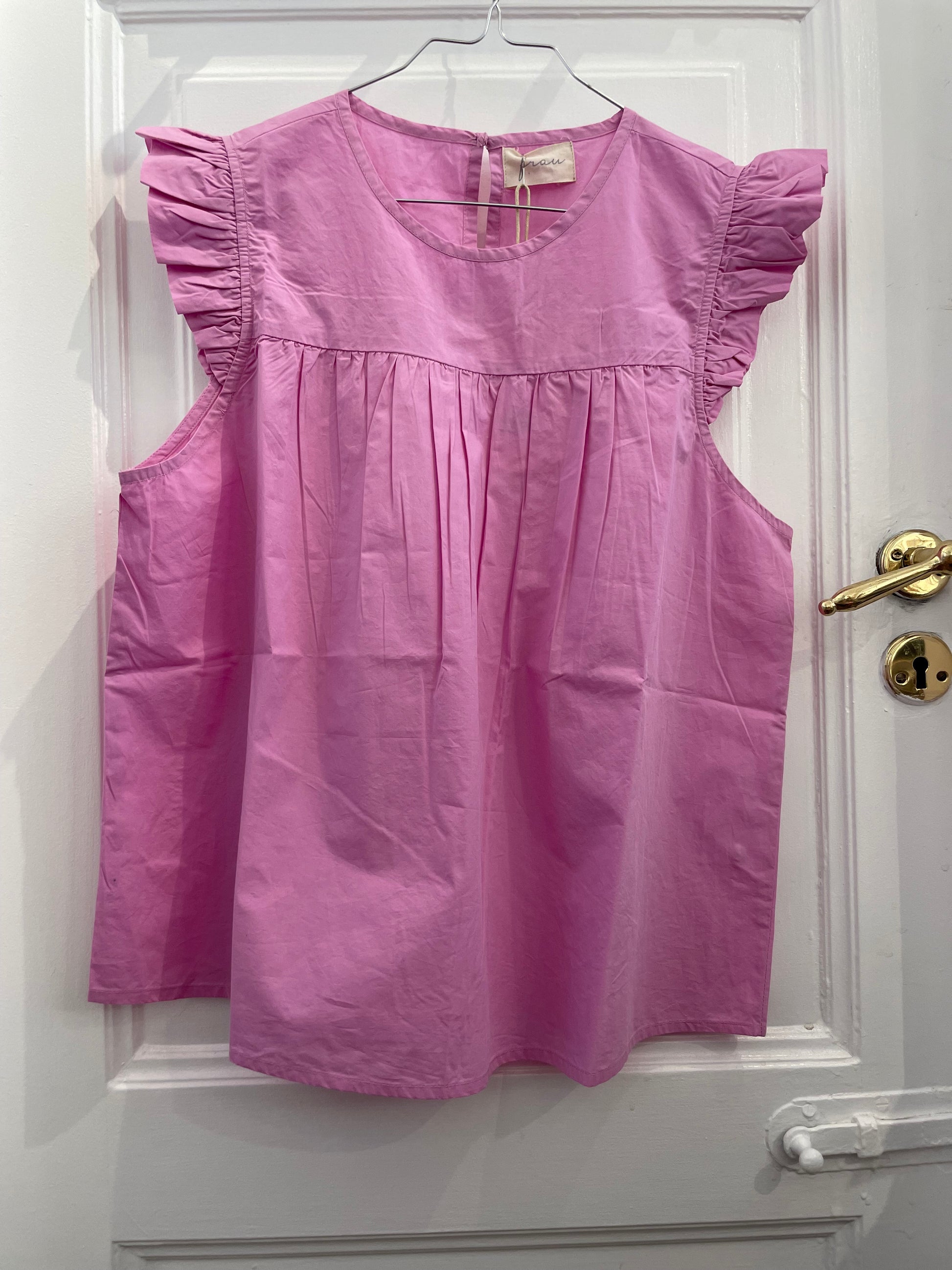 Ærmeløs top med flæser ved skuldrene, sød flæsedetalje over brystet og knaplukning bagpå.