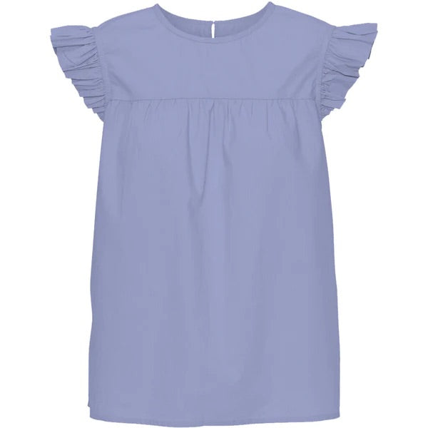 Ærmeløs top med flæser ved skuldrene, sød flæsedetalje over brystet og knaplukning bagpå.