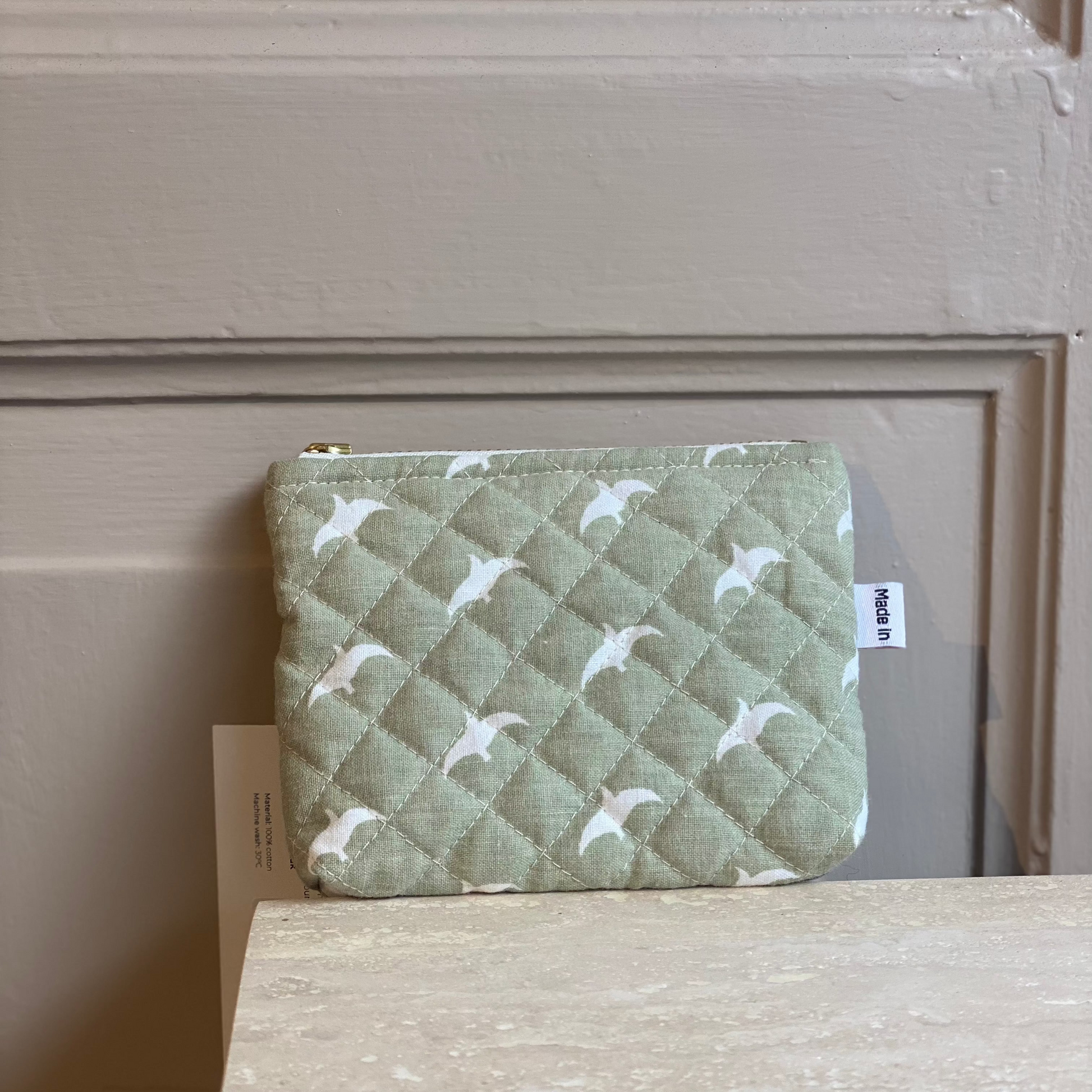 Håndsyet Makeuppung/Pung i upcyklet stof, Grøn m. Hvide fugle - Vita Vass