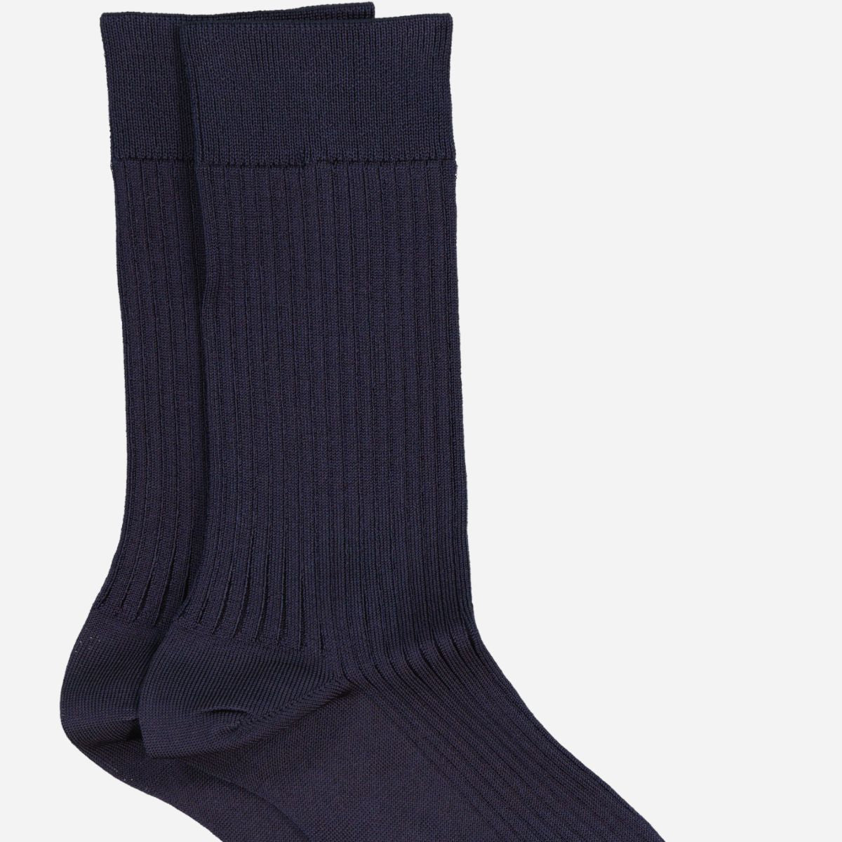 Mrs. Silky's fine ribbede sokker i farven navy, lavet med slanke og skinnende regenererede fibre