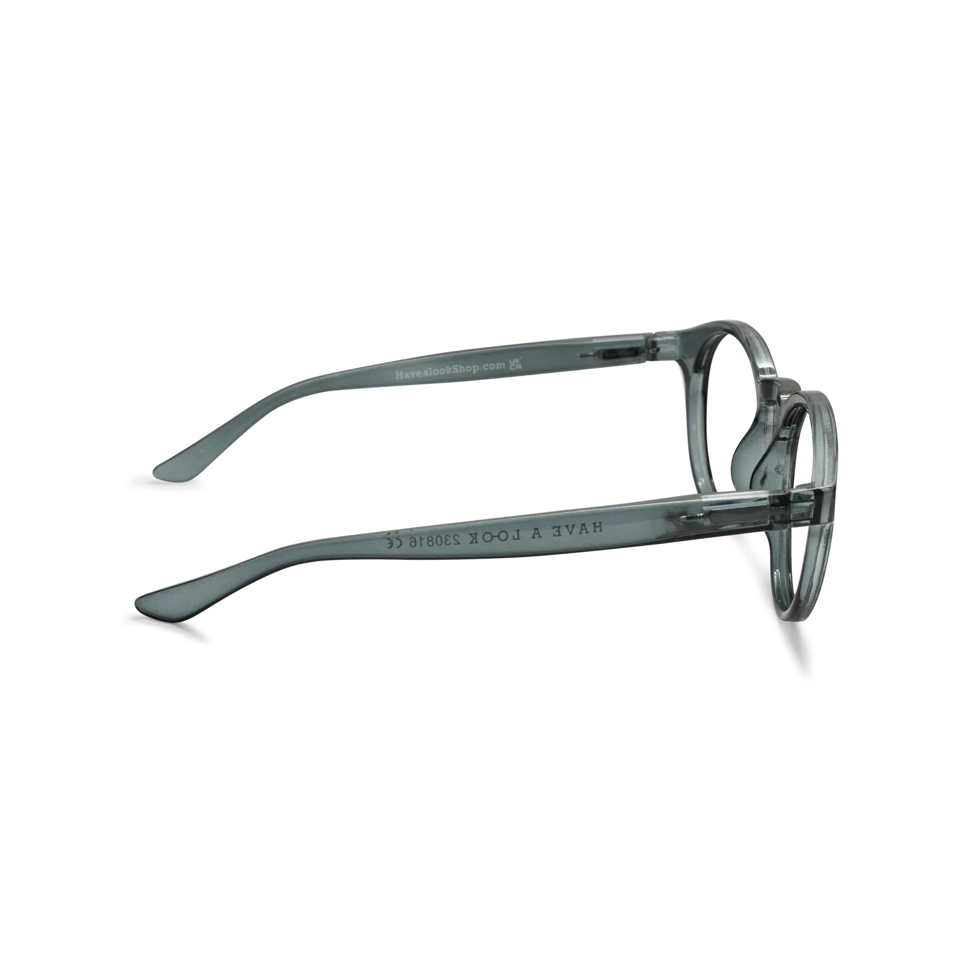 Runde læsebriller med halvtransparent gråt stel. ’Casual’ fra Have A Look er tidløse og eksklusive uden at være prangende. Det mellemstore, runde, markante stel passer til de fleste ansigtsformer og er let og behageligt at have på. Et godt valg, hvis du vil syne af noget uden at være for meget.