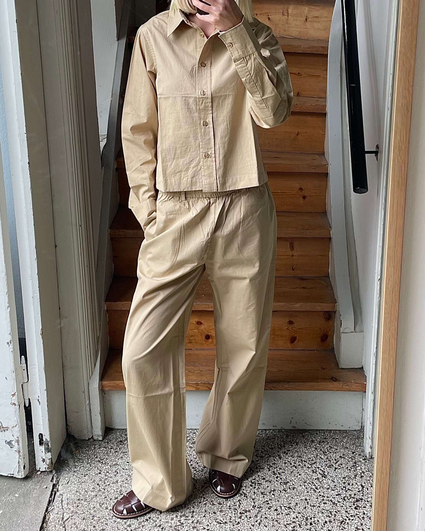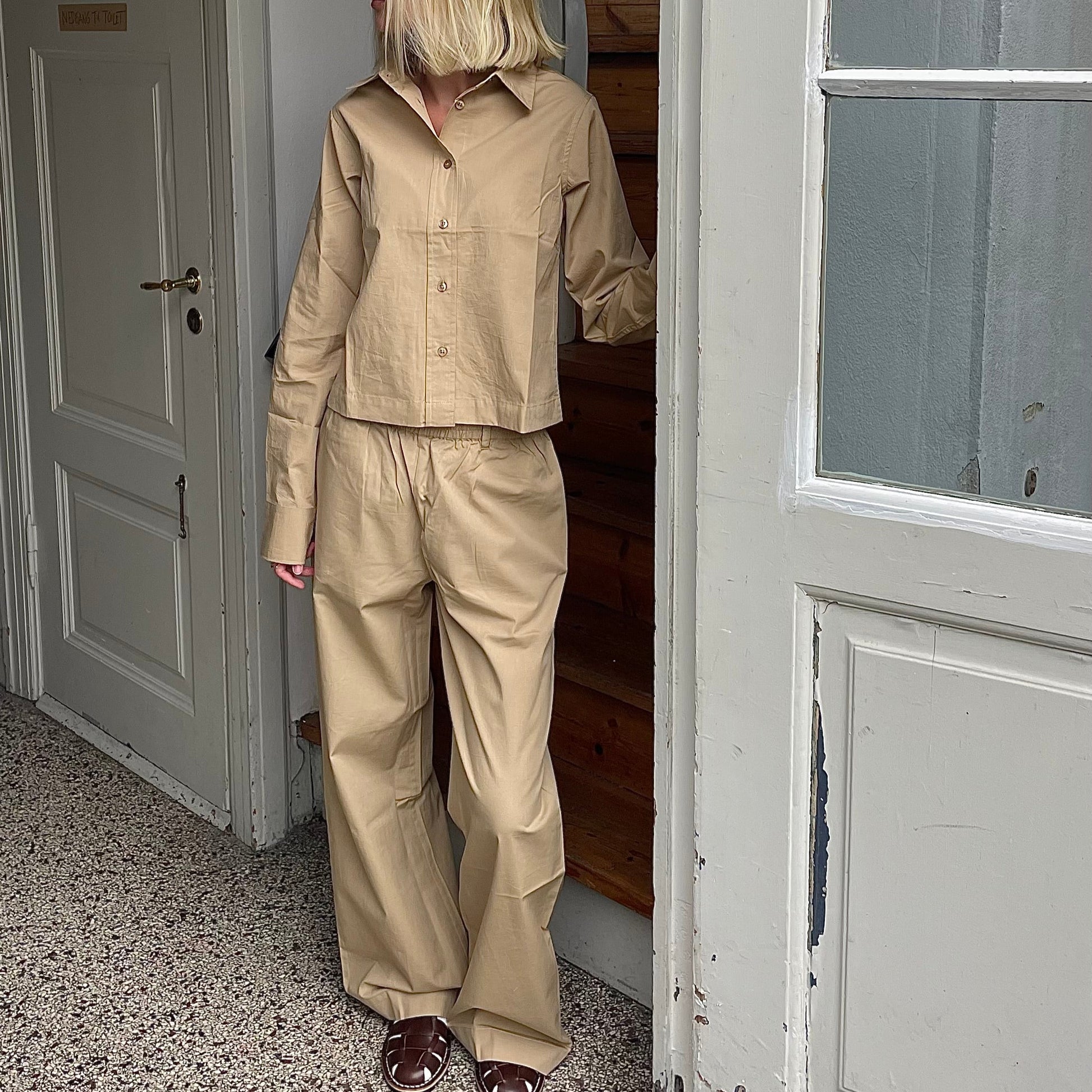 Skønne bukser lavet i 100% bomulds poplin. De har elastic i taljen og lommer i siden samt 2 baglommer