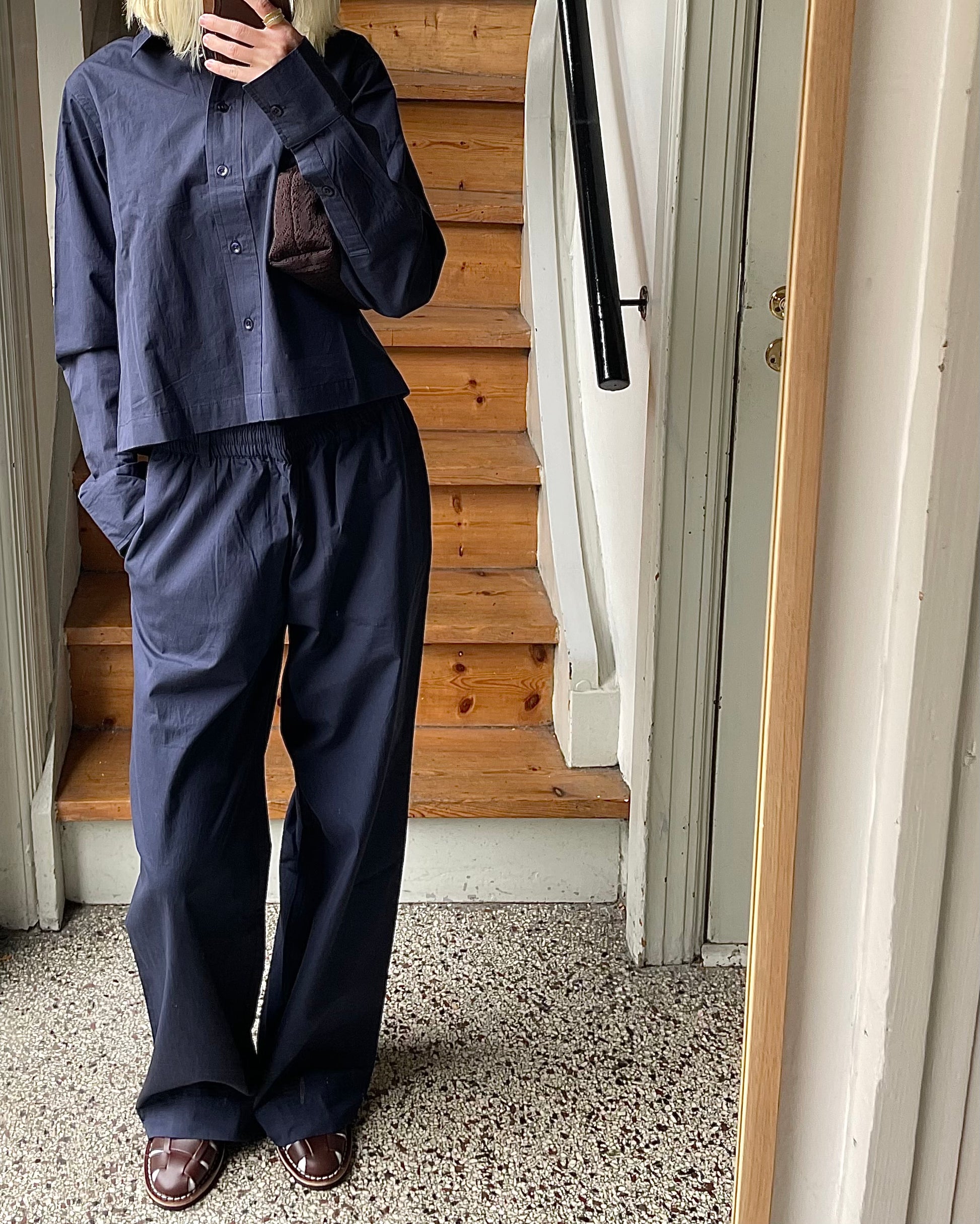 Skønne bukser lavet i 100% bomulds poplin. De har elastic i taljen og lommer i siden samt 2 baglommer