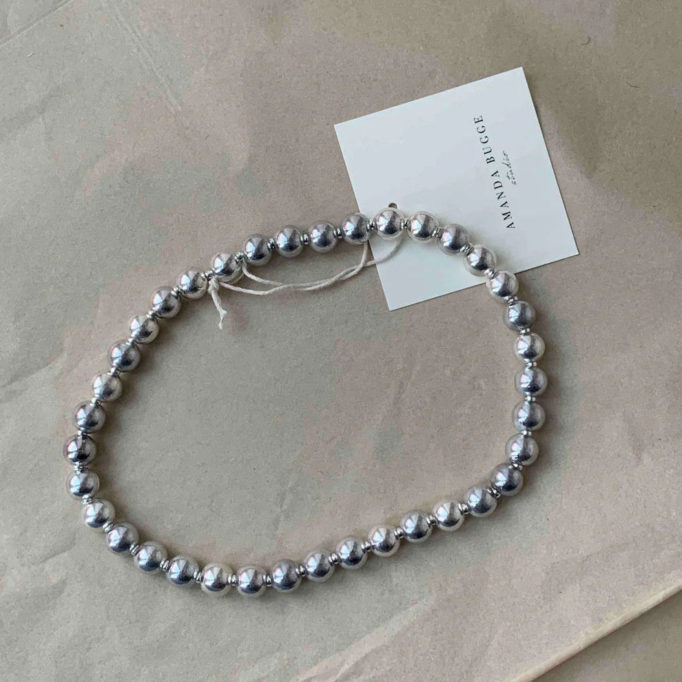 Sølvplisserede metallerperler og voksperler på elastisk snor.
