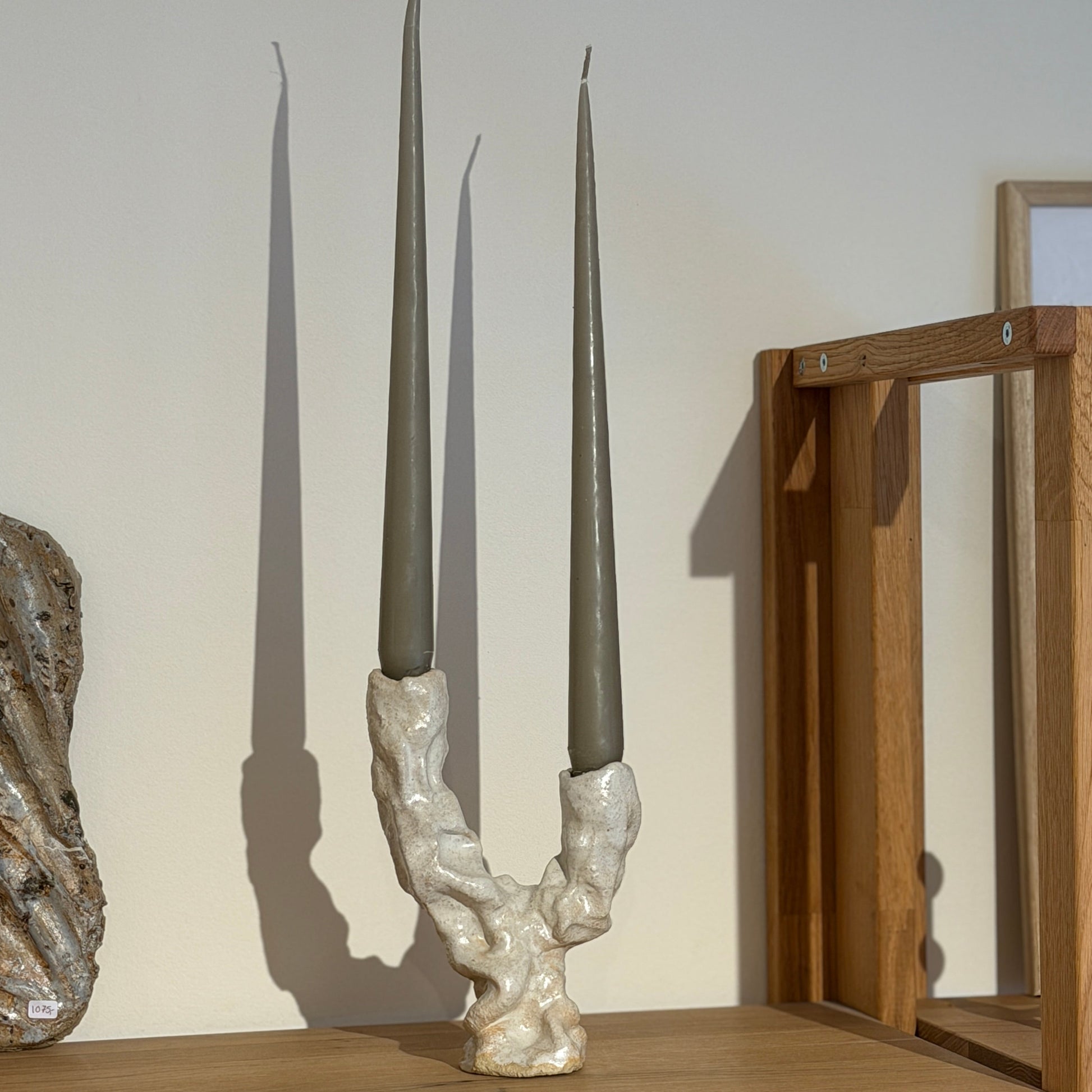 Håndbygget skulpturel unika lysestage, af Leela Mette. Stagen er glaseret i et tyndt lag beige for et smukt samspil med det grove ler. Denne stage er ideel som et stilfuldt interiørelement, også uden lys.
