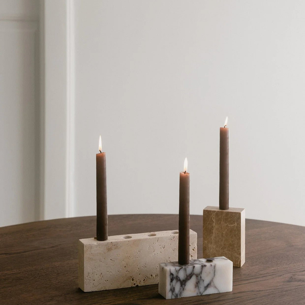 Epode er en lille serie af tre smukke lysestager i natursten, der tilsammen skaber et dynamisk spil mellem overflader, farver og dimensioner. En smuk treenighed.