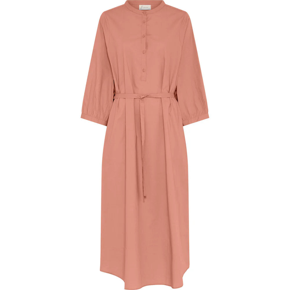 Madrid kjolen har kinakrave og halv stolpelukning. Kjolen er lang, har rummelige ærmer, forneden runder kjolen let og giver et fint, blødt udtryk. På ryggen er en lav skæring med et enkelt læg. Derudover har kjolen 2 sidelommer og et smalt bælte, som kan bindes omkring taljen - eller du kan lade kjolen hænge løst.