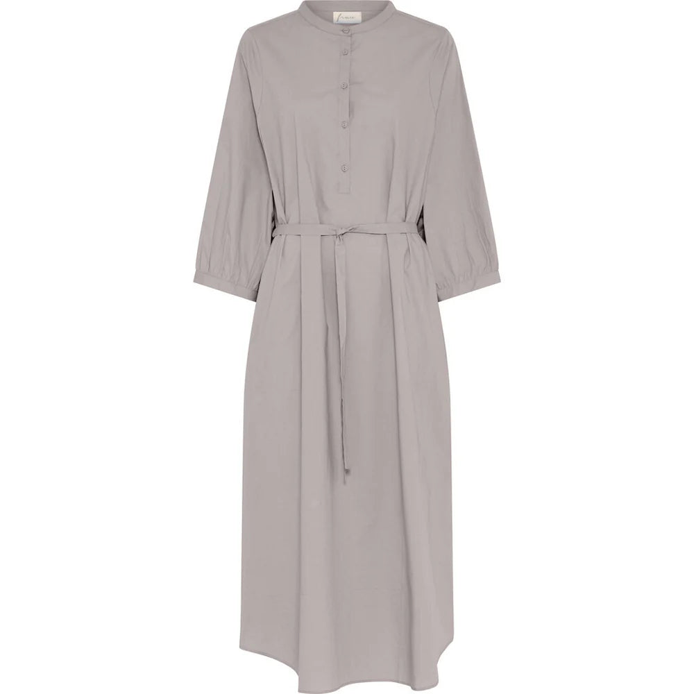 Madrid kjolen har kinakrave og halv stolpelukning. Kjolen er lang, har rummelige ærmer, forneden runder kjolen let og giver et fint, blødt udtryk. På ryggen er en lav skæring med et enkelt læg. Derudover har kjolen 2 sidelommer og et smalt bælte, som kan bindes omkring taljen - eller du kan lade kjolen hænge løst.
