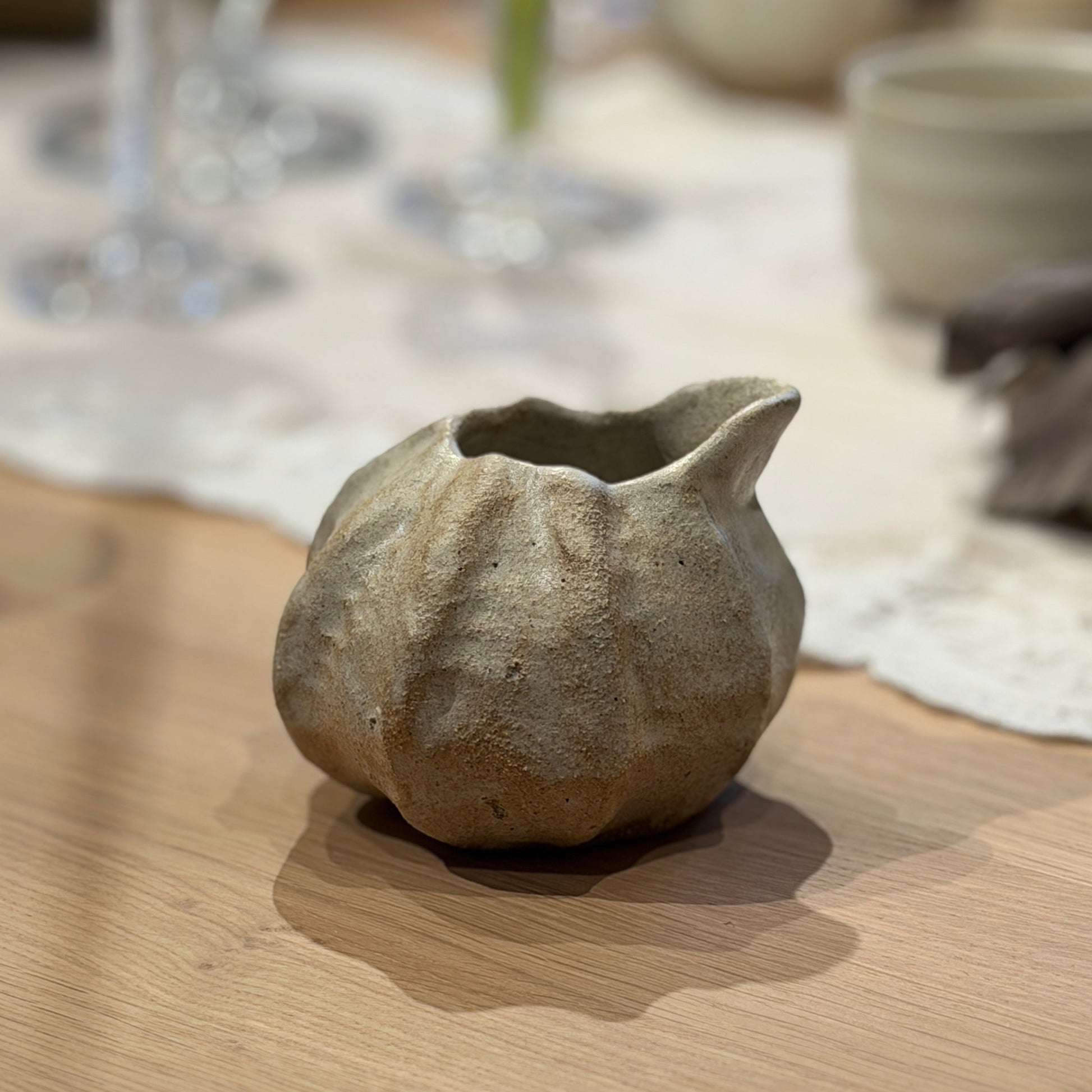 Håndbygget unika mælkekande af Leela Mette. Den er glaseret i en smuk beige silkemat glausur der giver en varm farve og masser af struktur i sammensmeltningen med den brune ler.