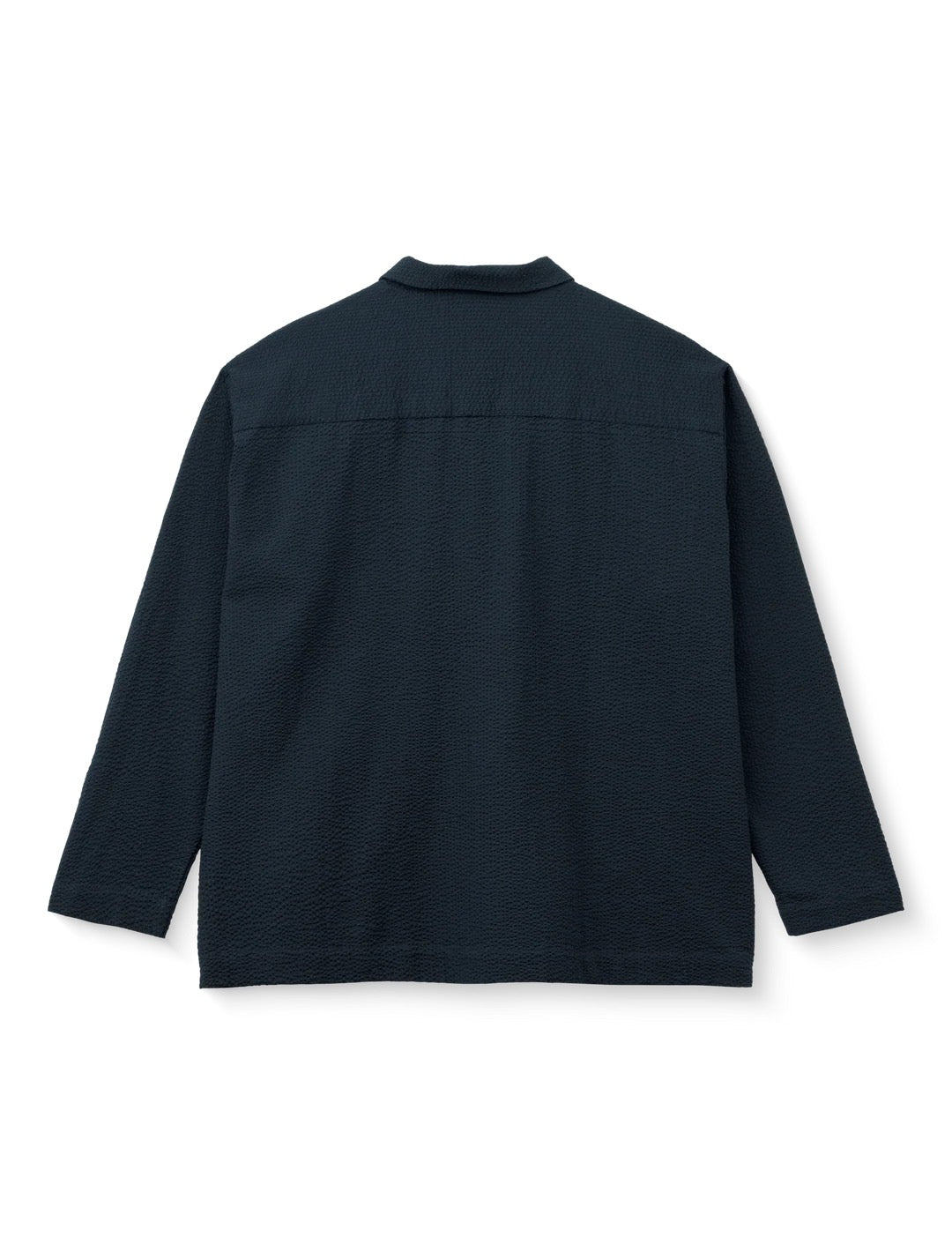 Skjorten har klassiske detaljer med krave, knapper fortil og påsyede forlommer.