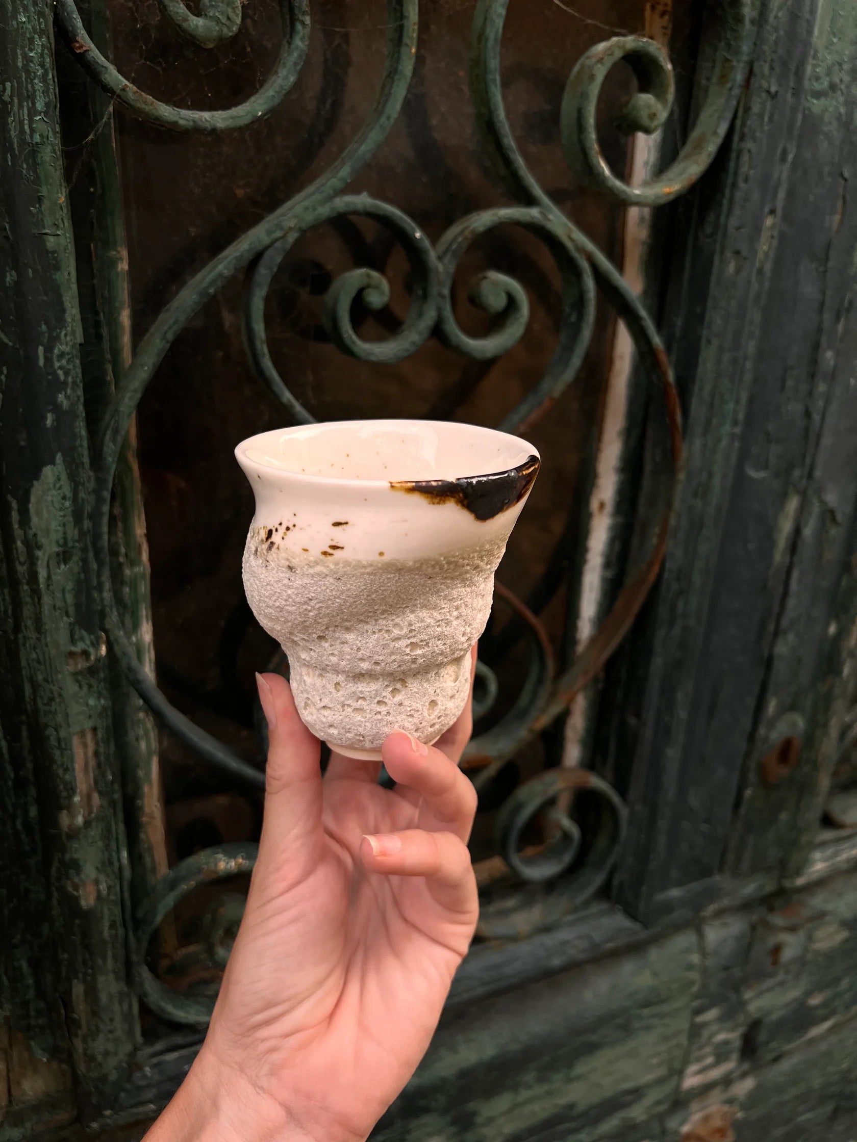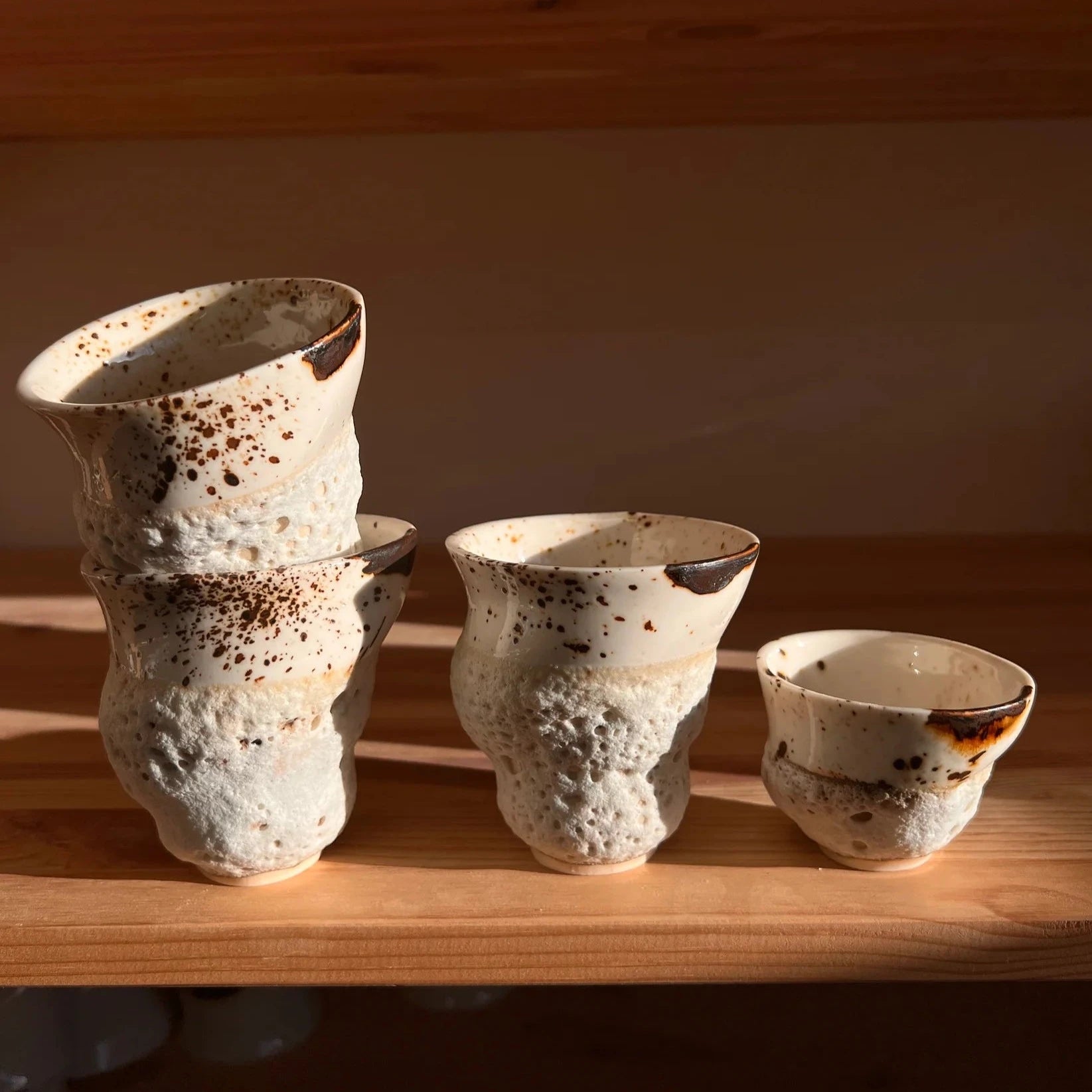 Effektglasuren kan være sart på grund af hulrummene og boblerne. Glasuren er mat og kan og vil smuldre i skummet så derfor er der ikke garanti på skum glasuren. Det er det levende og smukke ved koppen, at den mærkes af livet lige som naturen forandres.