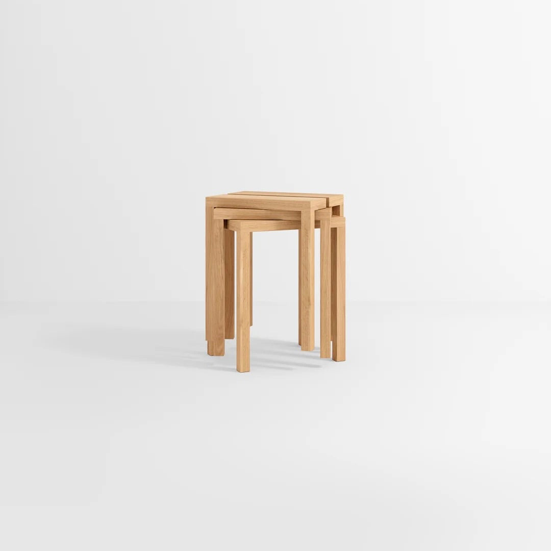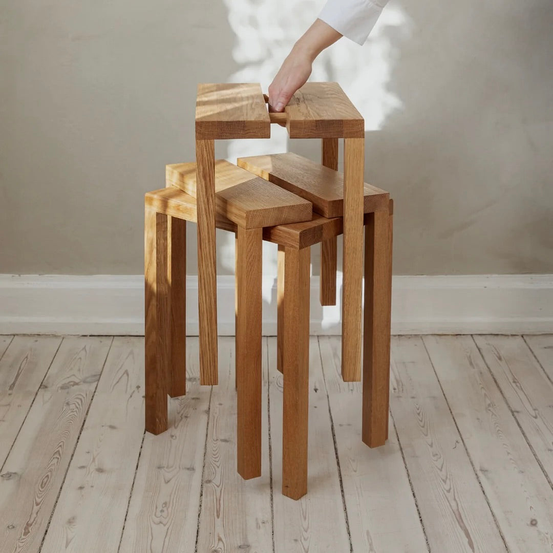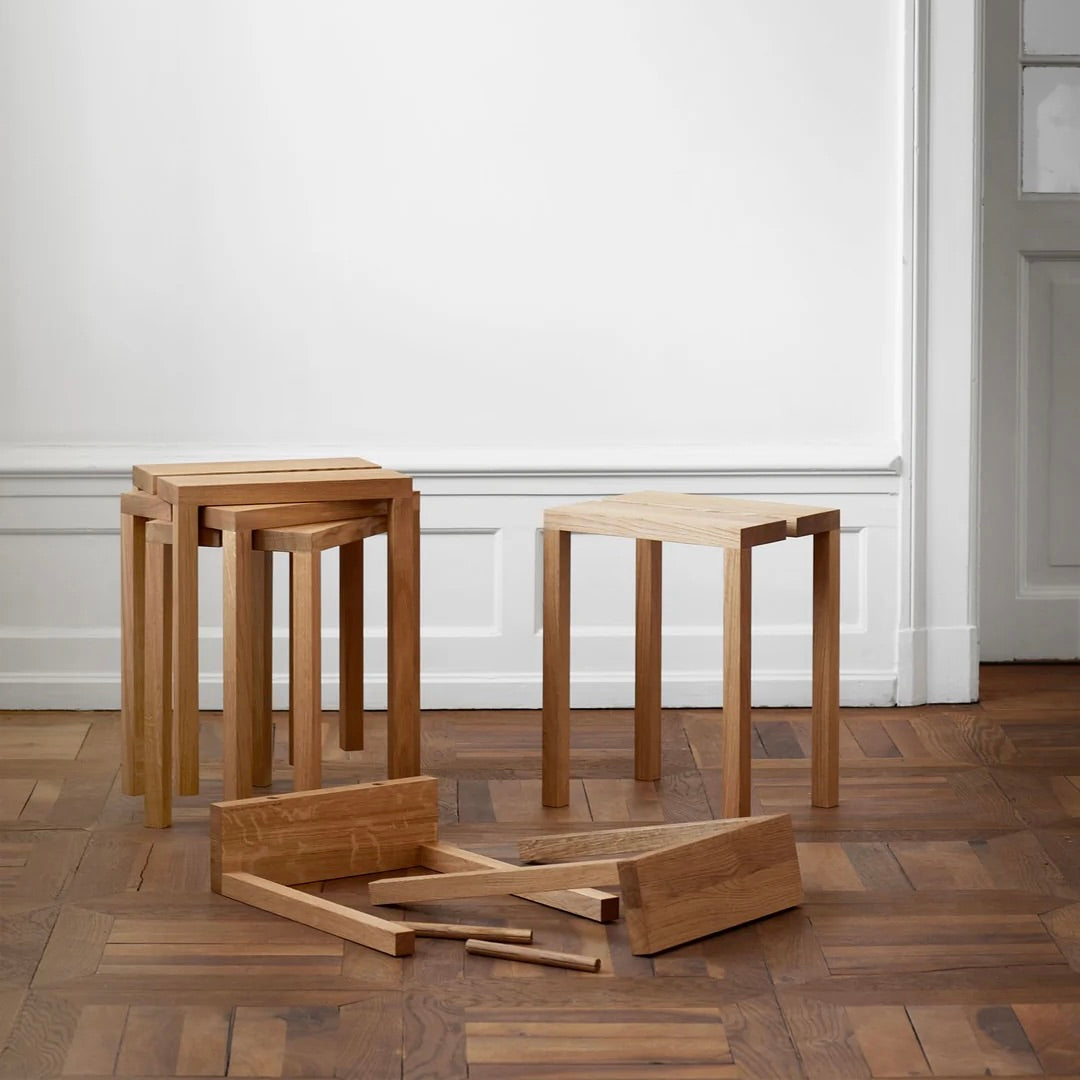 Peg Stool er dannet af to halvdele, forbundet med træpløkke. Ud over at holde skamlen sammen, skaber dette en praktisk slids langs midten, der gør det nemt at flytte skamlen rundt med en enkelt hånd. Åh, og op til tre kan stables sammen for at holde tingene pæne og ryddelige.