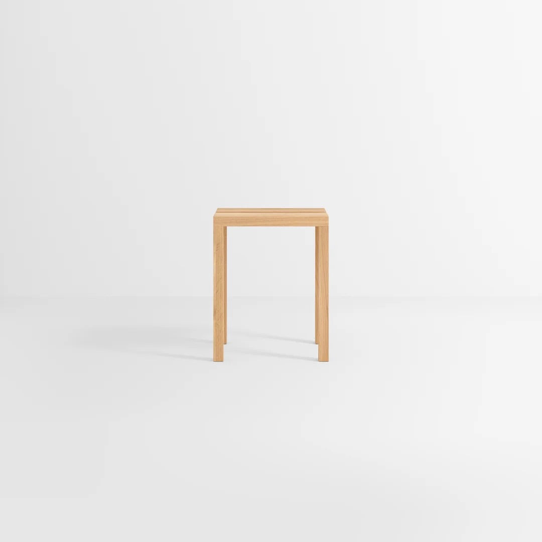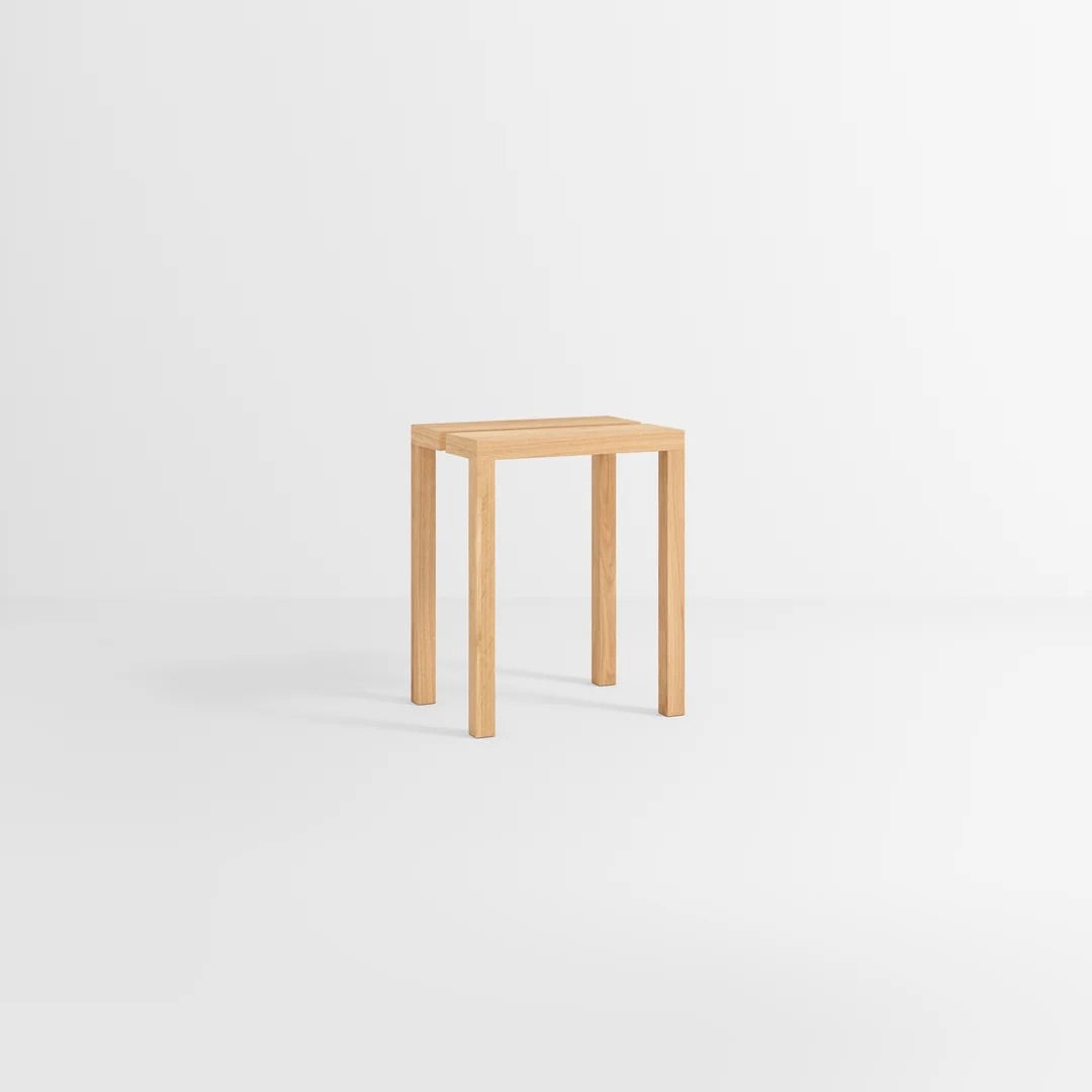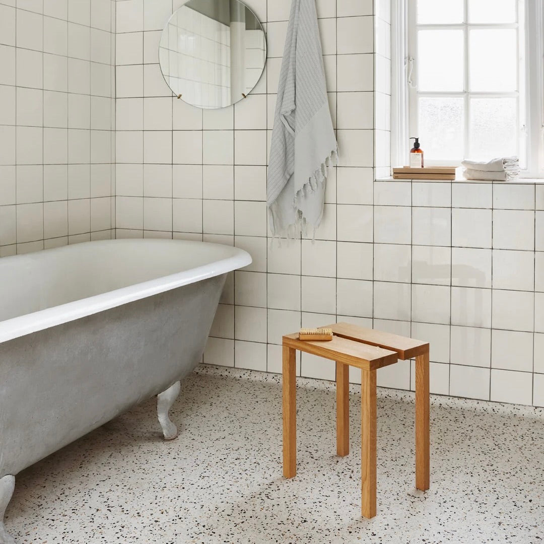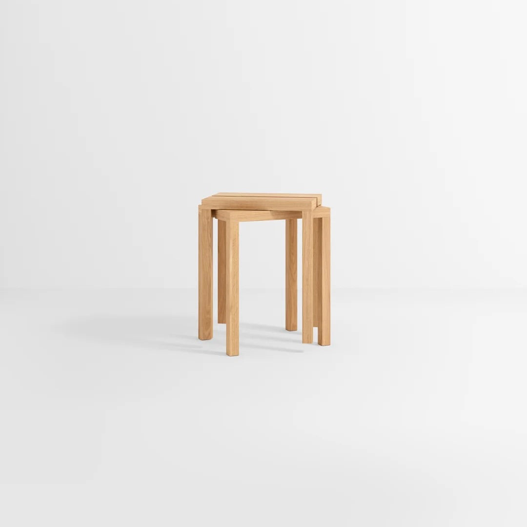 Peg Stool er dannet af to halvdele, forbundet med træpløkke. Ud over at holde skamlen sammen, skaber dette en praktisk slids langs midten, der gør det nemt at flytte skamlen rundt med en enkelt hånd. Åh, og op til tre kan stables sammen for at holde tingene pæne og ryddelige.