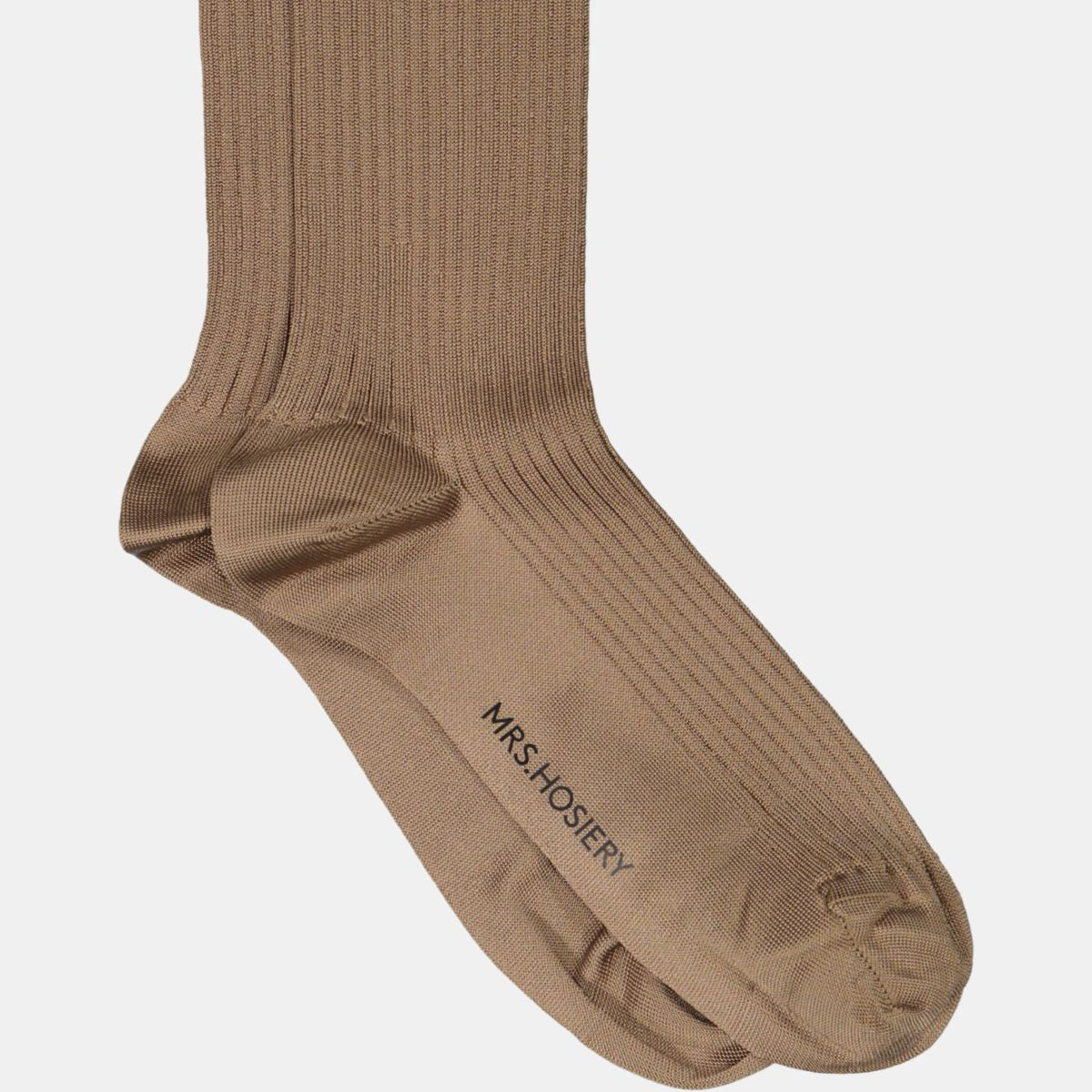 Mrs. Silky's fine ribbede sokker i farven chocolate, lavet med slanke og skinnende regenererede fibre