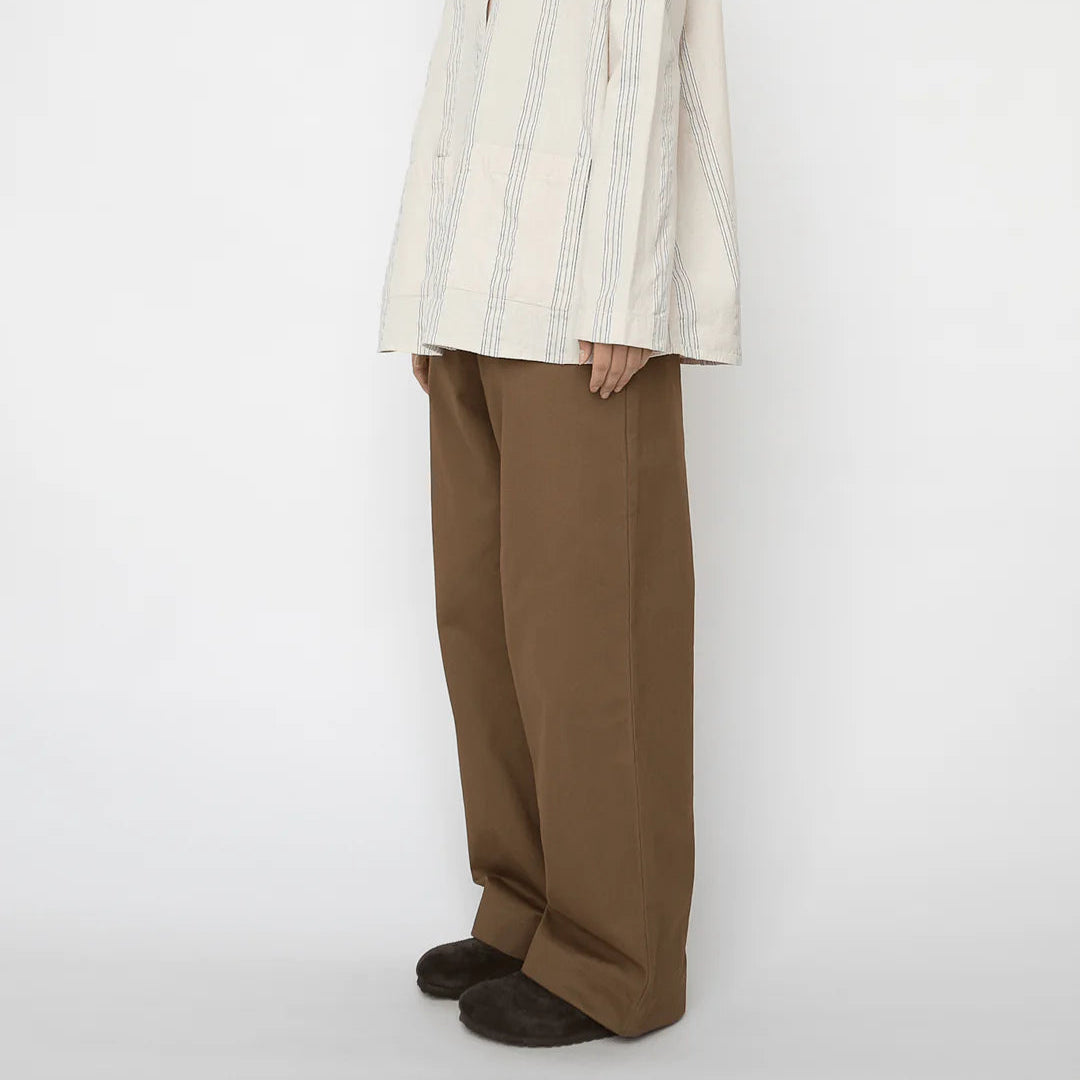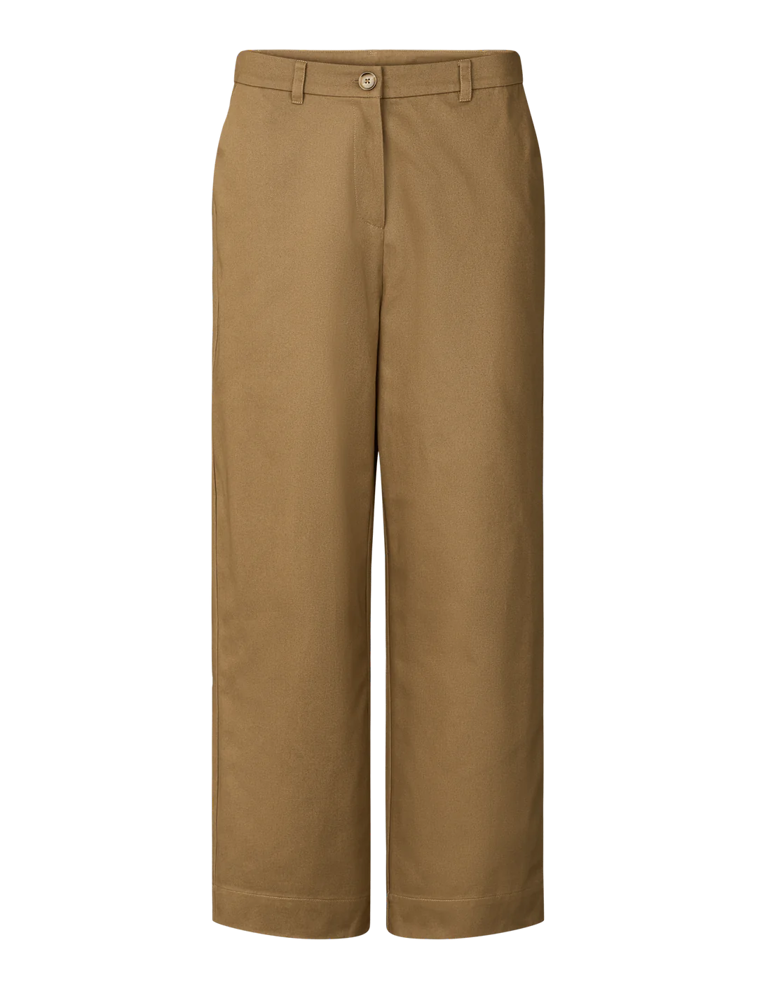 Skønne bløde bomuldsbukser med et klassisk udtryk i en vævet twill. Vide lige ben og fast lining med en enkelt knaplukning og bæltestropper. Brug dem med en striktrøje først i sæsonen og senere med en lille top eller skjorte og sandaler. Et lille opsmøg på buksen giver dem et mere luftigt forårslook.