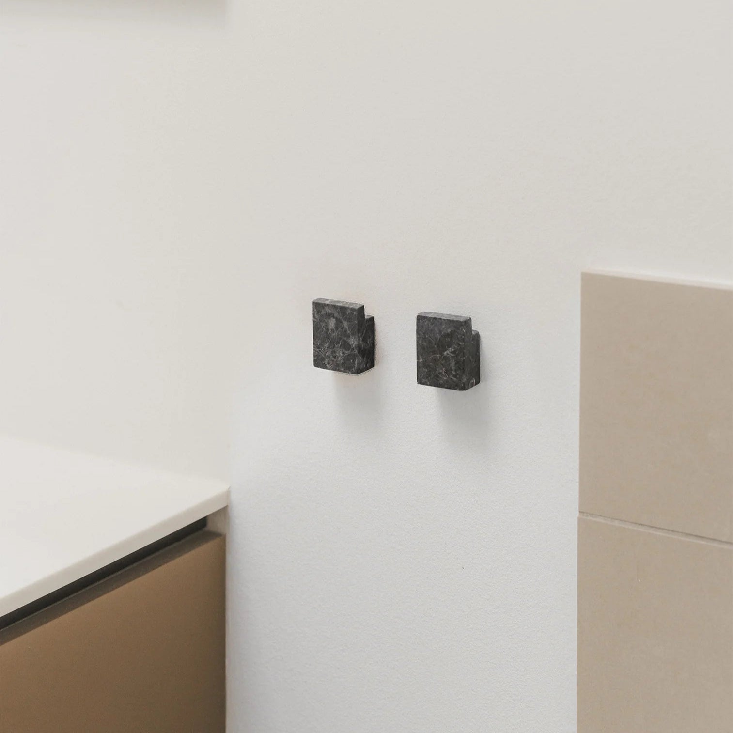 Øster er en lille serie af firkantede knager og greb i natursten. Det simple design sikrer en god funktionalitet, der passer ind i langt de fleste hjem. Brug dem på badeværelset til håndklæder, i køkkenet til viskestykker, eller i entréen til overtøjet.
