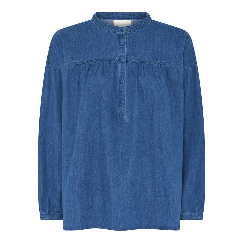 Paris denimskjorte har lange ærmer, kinakrave og feminine rynker på skæringen hen over brystet og ryggen. Ved ærmerne har den også lidt feminint rynk.