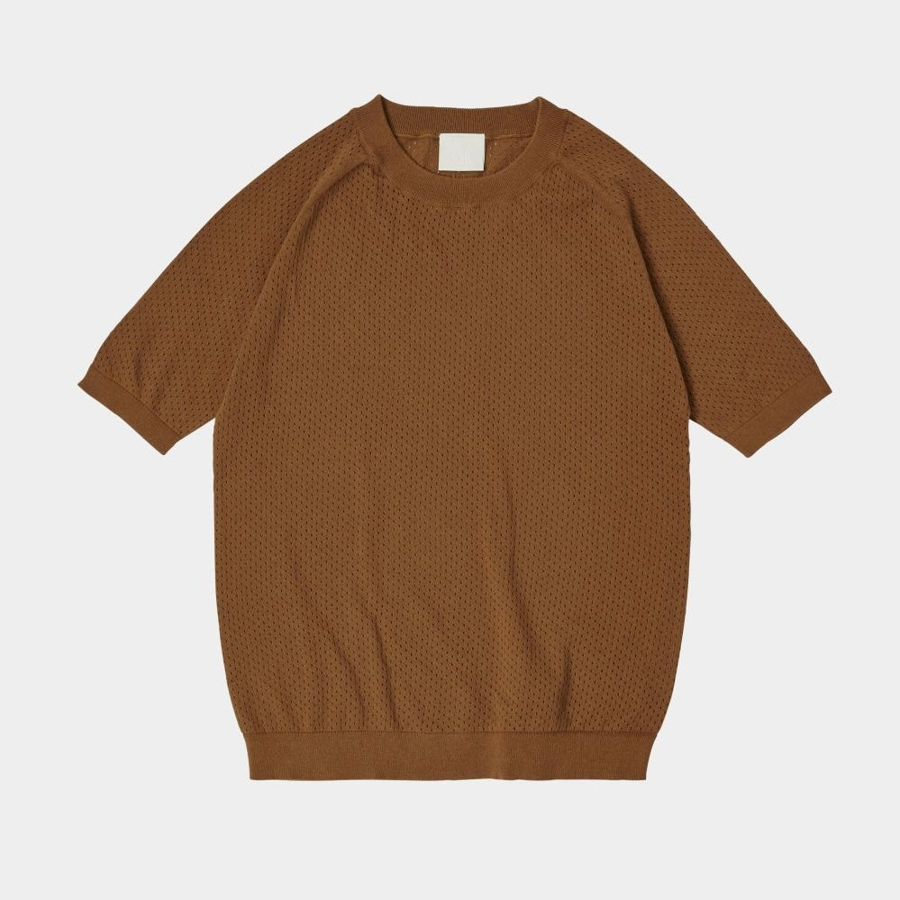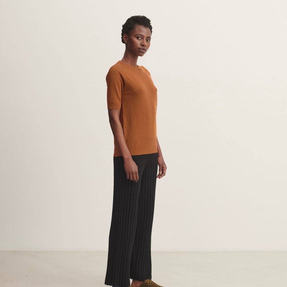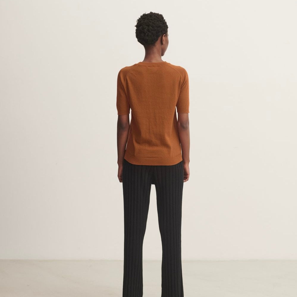 Denne T-shirt i økologisk bomuld er designet med saddle shoulder, rund halsudskæring og ribstrikkede detaljer ved krave og kanter. T-shirten har en regulær pasform og er strikket i et let, åbent pointelle mønster.