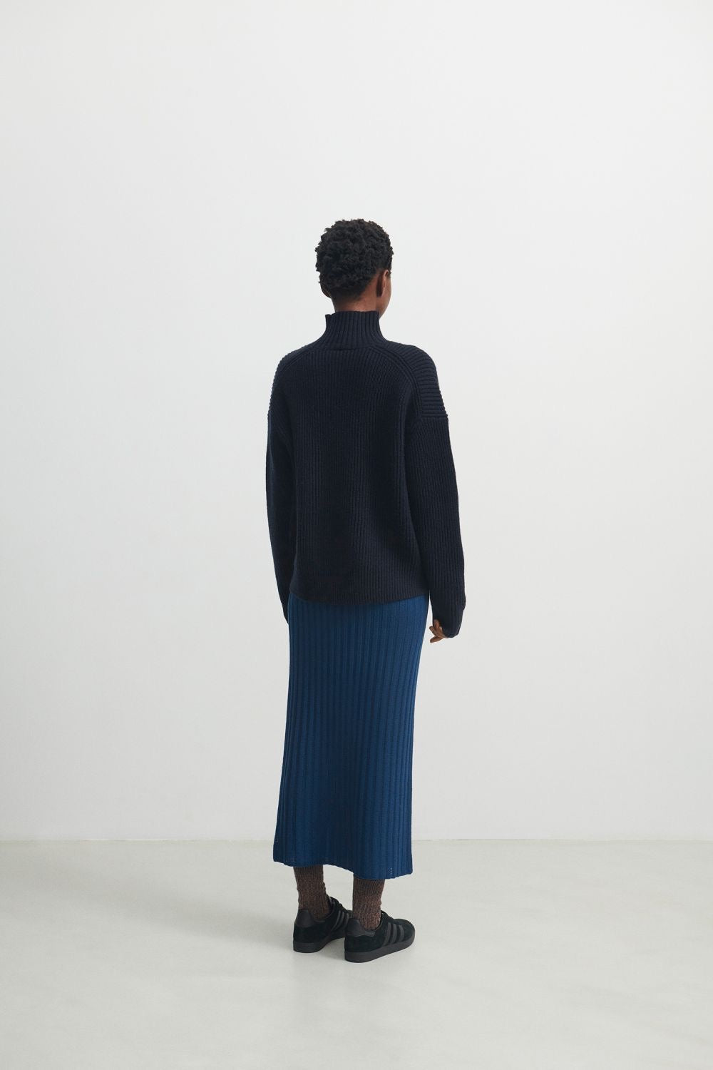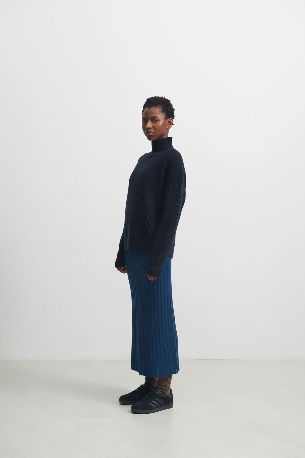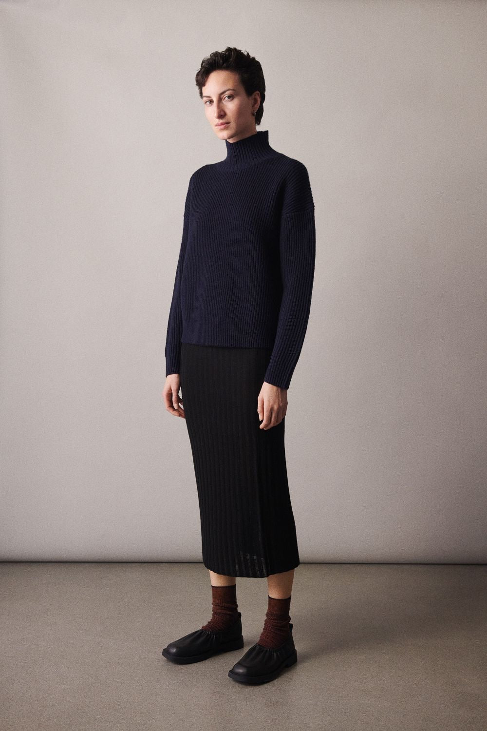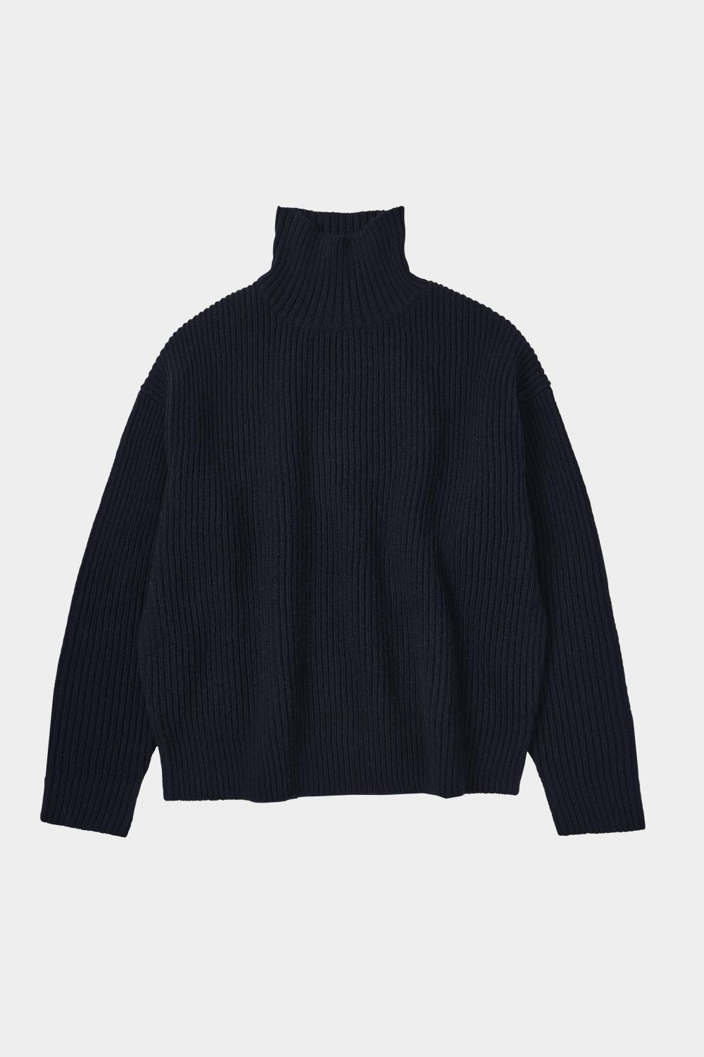 Denne klassiske sweater er strikket i en kraftig ribstruktur og har høj ribstrikket hals og lavt skulderpunkt. Sweateren har en almindelig, lidt oversize pasform og er lavet i en fast rå uldkvalitet, som har et lidt mere loddent udtryk end vores klassiske merinould. Uldgarnet kommer fra mulesing-fri får og er fri for skadelig kemi. Den fås i ensfarvet og i en stribet version.