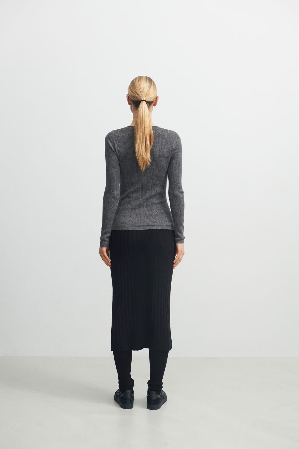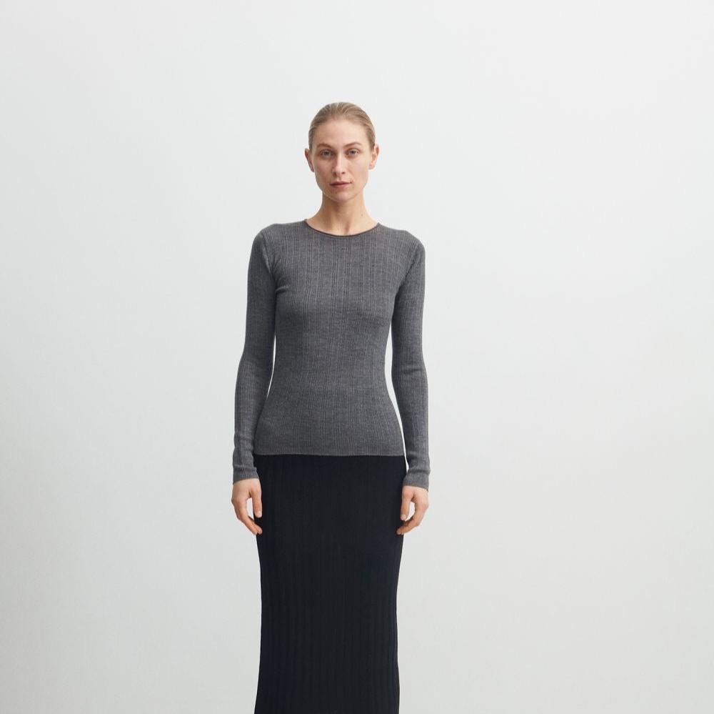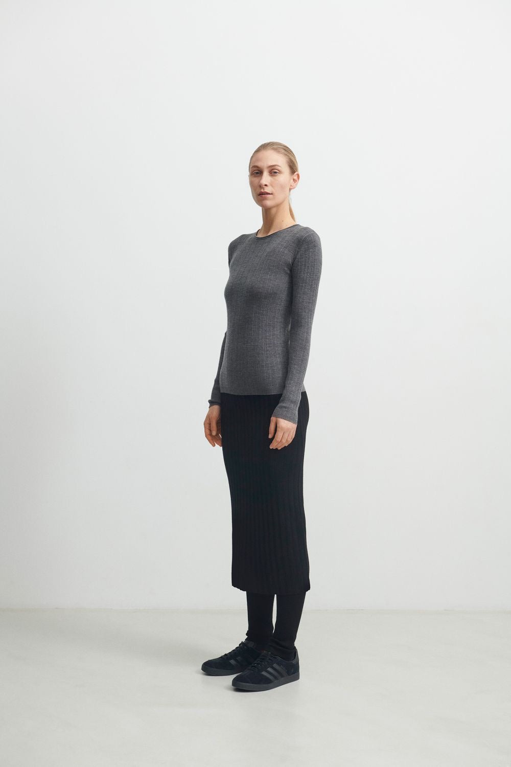 Denne langærmede bluse i ekstrafin merinould, er strikket i en irregulær ribstruktur. Den har en smal pasform, rullekant ved halsen og smalle ribkanter ved ærmer og søm. Brug den alene eller som det inderste lag. Vores uld kommer fra mulesing-fri får og er fri for skadelig kemi.