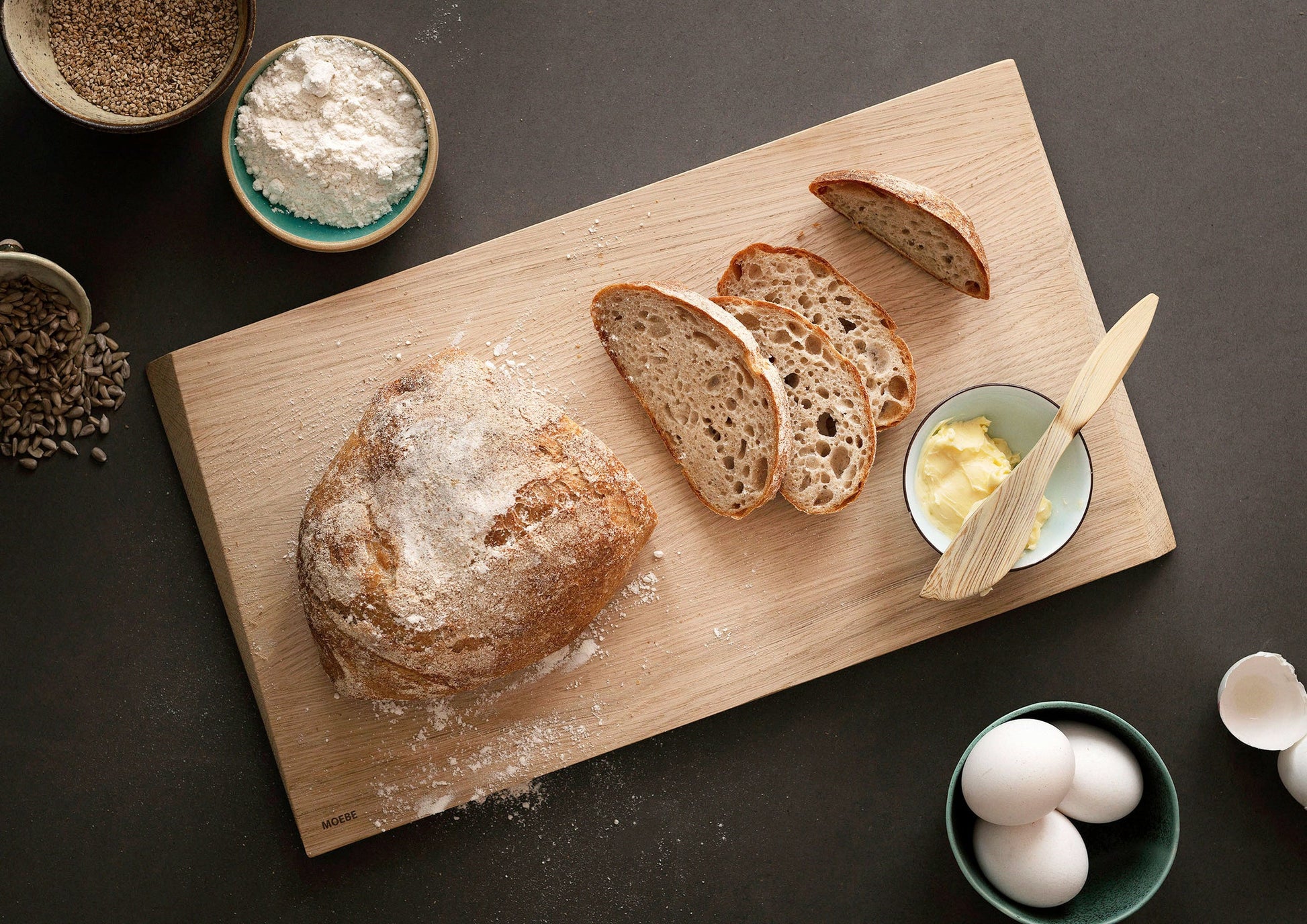 MOEBE skærebrættet er lavet af FSC-certificeret massiv europæisk eg. Produktet efterlades ubehandlet. Eg er naturligt antibakterielt, så det er ideelt til tilberedning af mad.