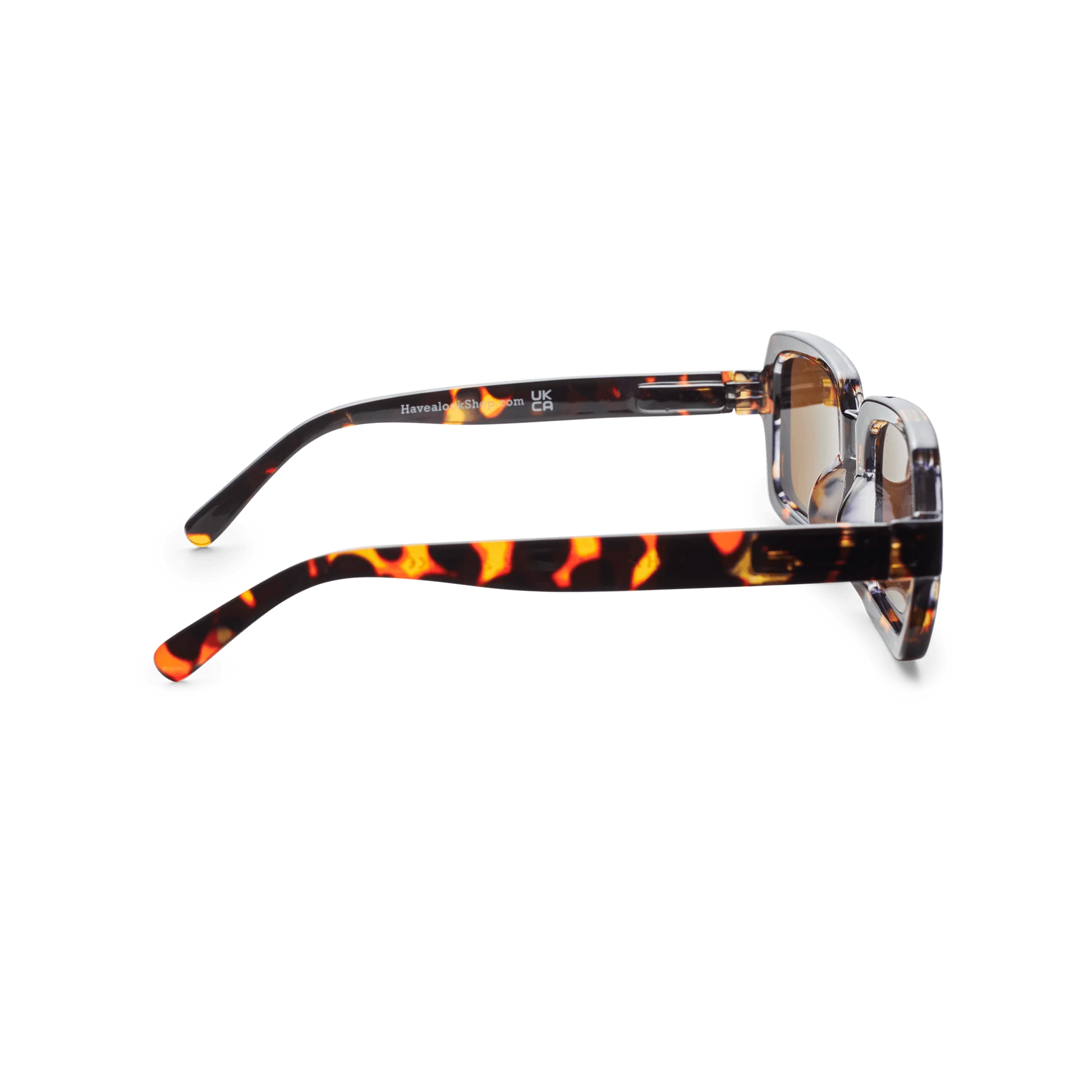 Firkantede retro-solbriller med brunt skildpaddefarvet stel. ’Square’ fra Have A Look er absolut et brilledesign, der giver ansigtet karakter. Det kraftige, firkantede stel i moderne retro-look rammer ansigtet flot ind, passer til de fleste, sidder godt på næsen og er samtidig forbavsende let og behageligt at have på.