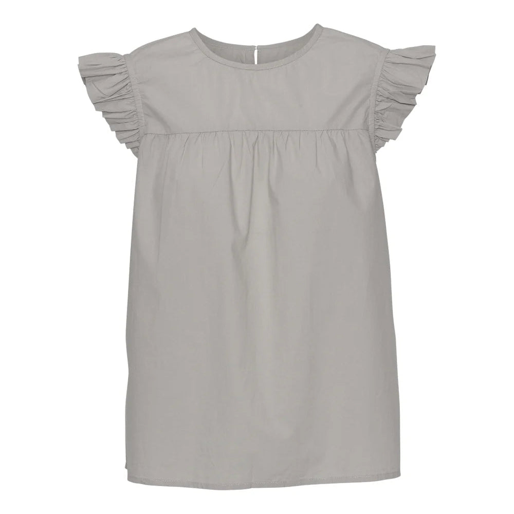 Stockholm toppen har flere søde detaljer; en fin lille flæse på skulderen, lette rynker ved skæringen foran og den runde halsudskæring lukkes med en knap bagpå.