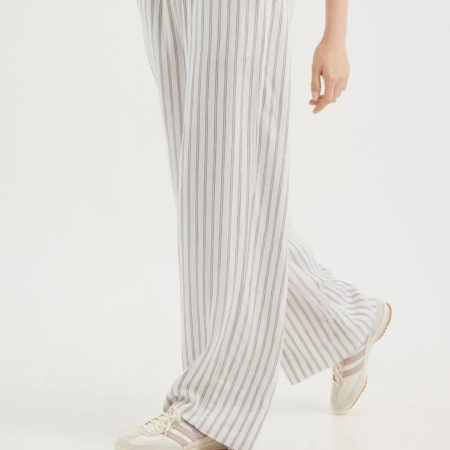 Disse afslappede og lette bukser, der udstråler ren velvære, bliver dit næste uundværlige item. Bukserne er lavet af en blød, stribet kvalitet bestående af en blanding af hør og økologisk bomuld. De brede ben tilføjer længde til bæreren, mens de skrå lommer i siderne og det indvendige bindebånd i taljen tilføjer funktionalitet og hygge. At tilføje disse bukser til din garderobe er en beslutning, du ikke vil fortryde.
